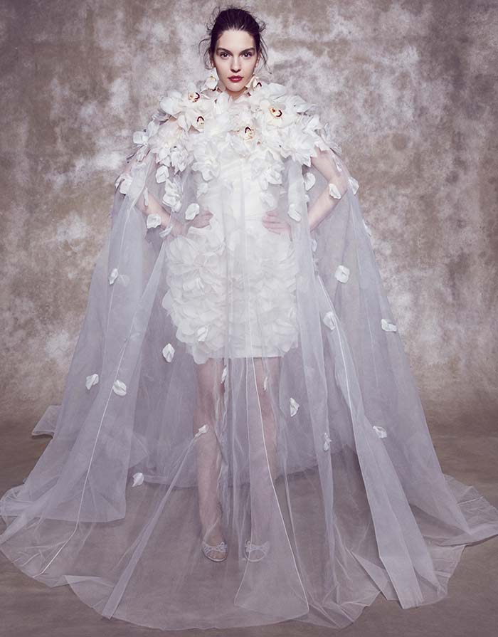 - Volumes et 3D. Marchesa ne poursuit pas les matériaux les plus modernes et les plus douteux, mais ils n'oublient pas la popularité des volumes. De nombreuses robes de la collection 2026 sont décorées de fleurs et de pétales en 3D.