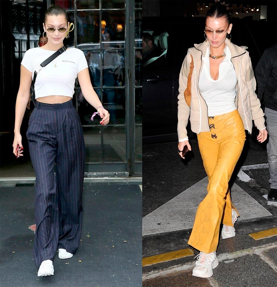 Un tailleur-pantalon peut être facilement transformé d'une tenue de bureau à une tenue de soirée. Si vous n'avez pas le temps de vous changer après le travail pour un dîner de fête ou une soirée mondaine, il suffit de compléter le costume avec des talons aiguilles, un haut élégant et des accessoires lumineux. C'est ce que Gigi a fait lors de l'un des événements. Bien que Bella n'ait toujours pas refusé des chaussures confortables - des baskets. Un tel mélange de style business et sportif est plus que pertinent aujourd'hui.