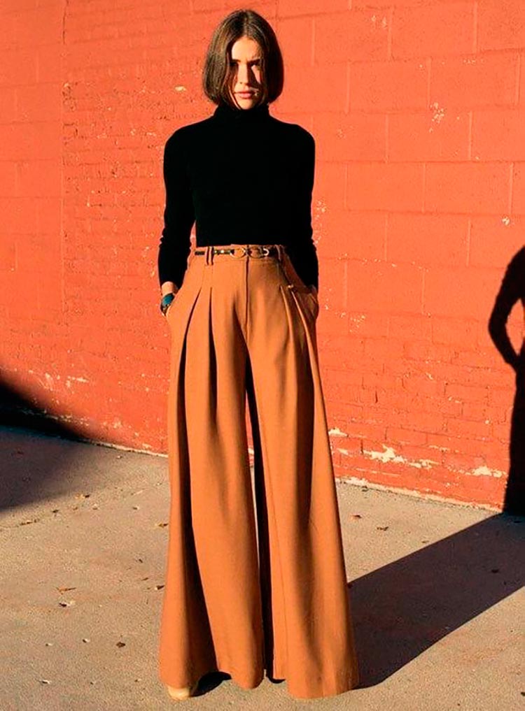 5. Pantalon au sol. Un excellent moyen de cacher les talons hauts et la plateforme, en même temps, cela vous rend plus grand et vos jambes infiniment longues. Par exemple, un pantalon palazzo ou un jean droit évasé allongera également vos jambes.