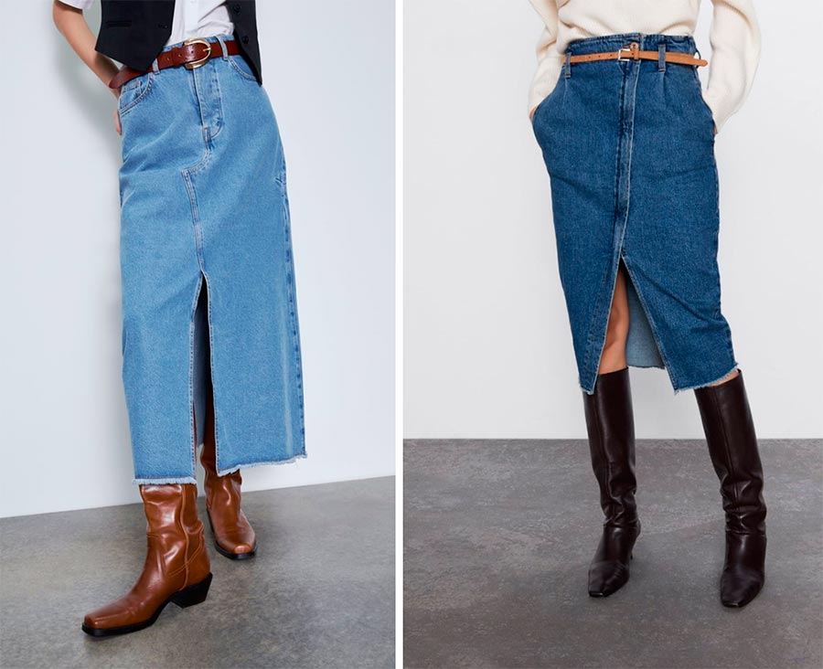 Mangue 3. JUPE LONGUE EN DENIM Les jupes en jean à taille haute et longueurs midi reviennent à leur apogée ! Associez-le à n'importe quoi, que ce soit des baskets épaisses, des bottines western ou des escarpins sophistiqués.