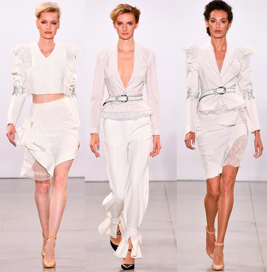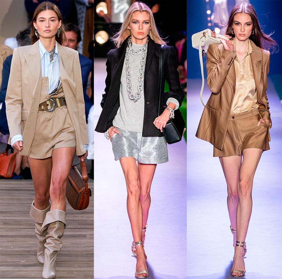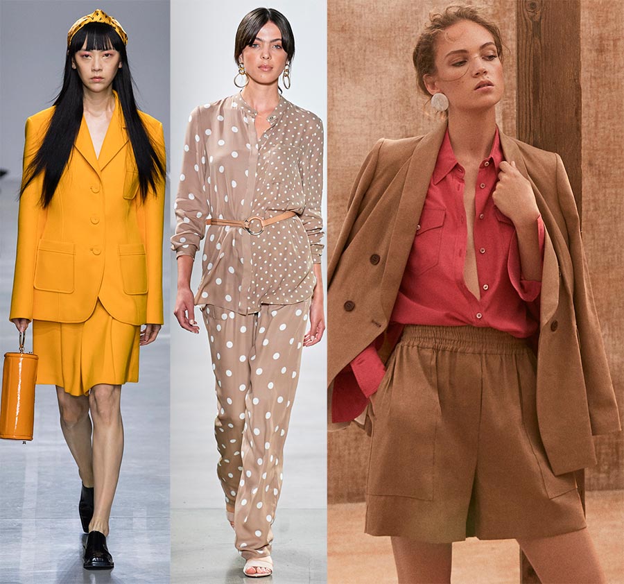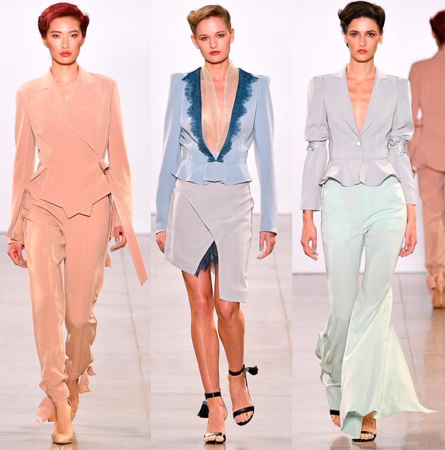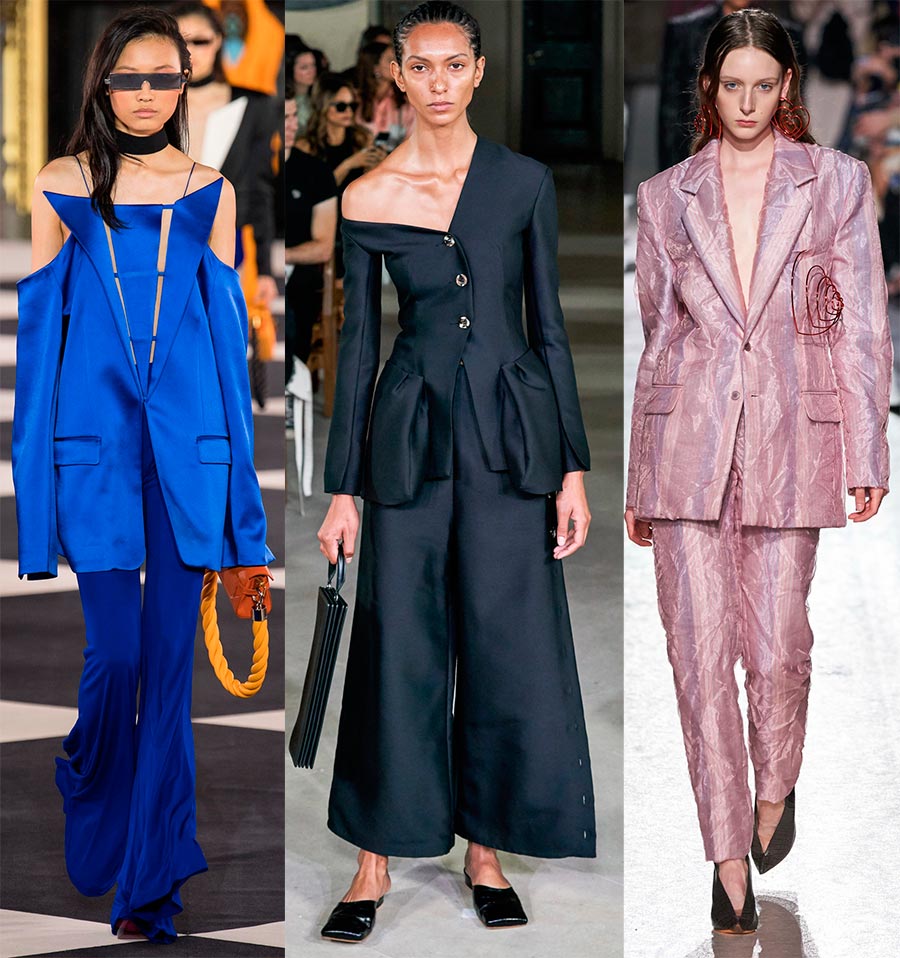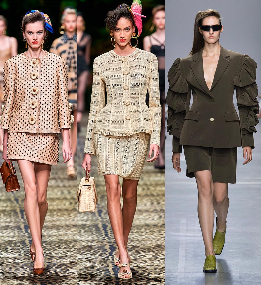 Par exemple, Alessandra Rich propose un costume avec une minijupe et un haut court, Alexander McQueen propose une coupe sophistiquée encadrée de dentelle, Fatima Lopes propose un costume turquoise vif avec une élégante asymétrie.
