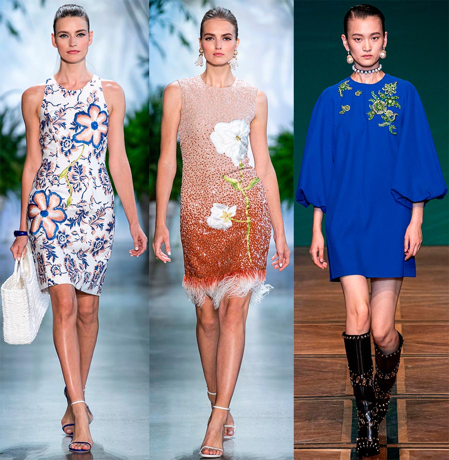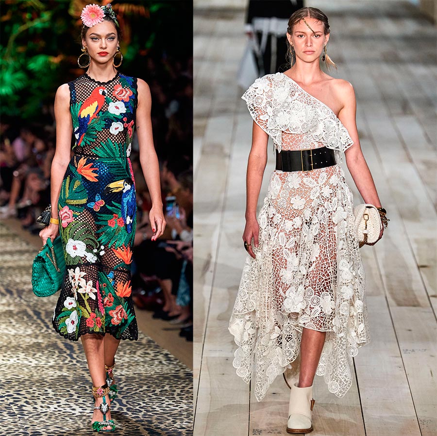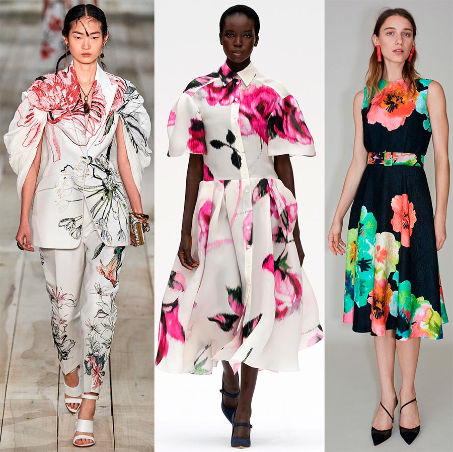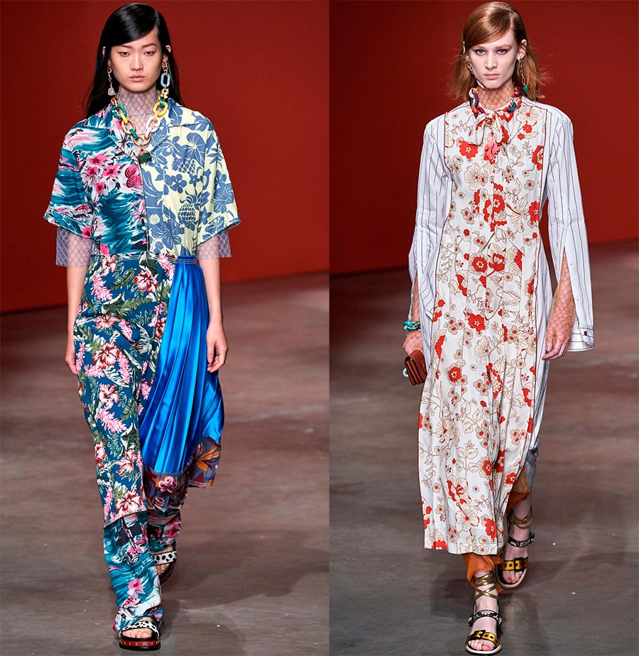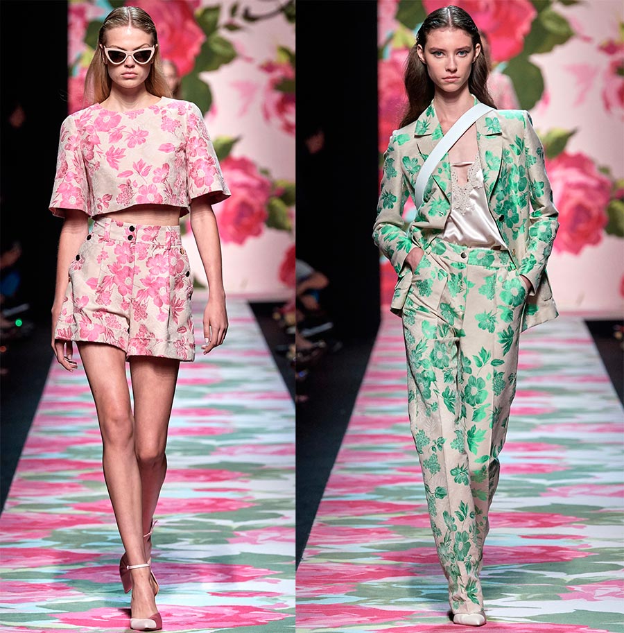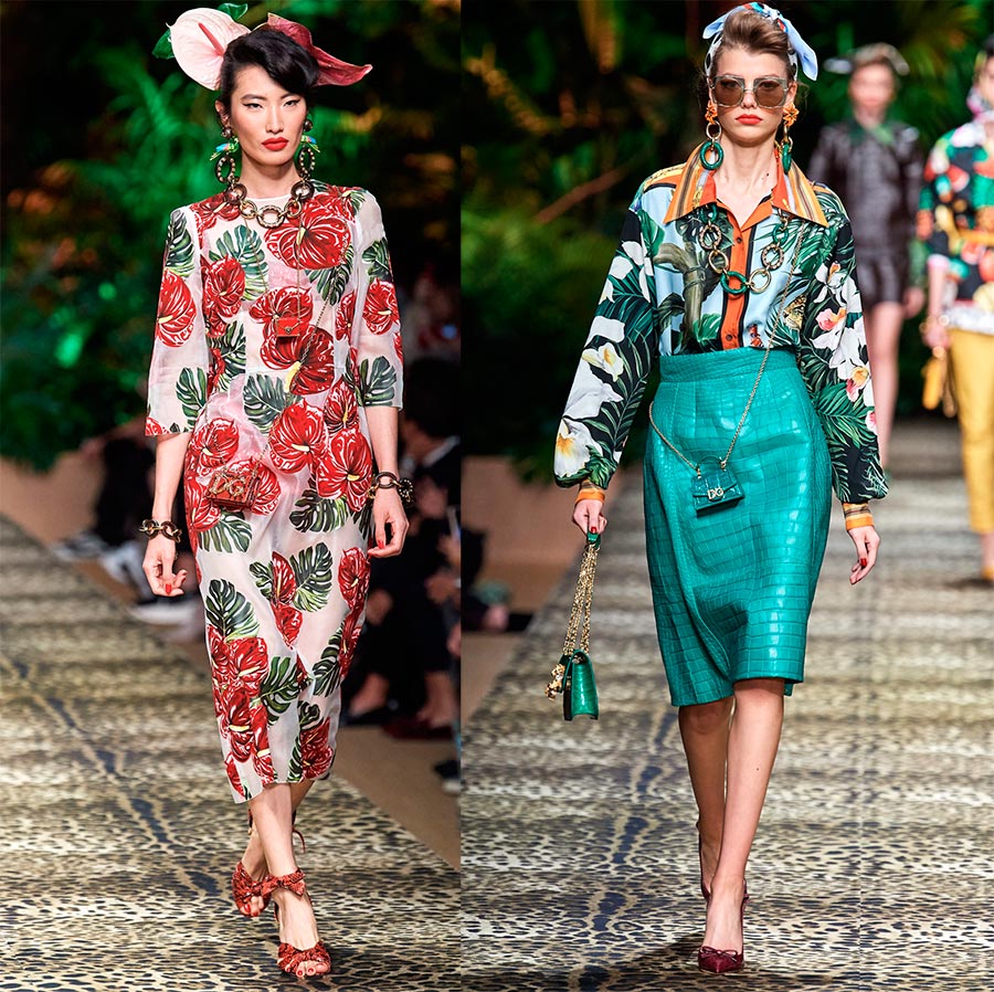 Les imprimés floraux tropicaux sont audacieusement associés à des sandales en peau de reptile. On peut voir des fleurs exotiques sur les robes et les chemisiers. Les looks brillants et saturés de couleurs vont bien en combinaison avec des jupes, des shorts et des vestes en cuir.