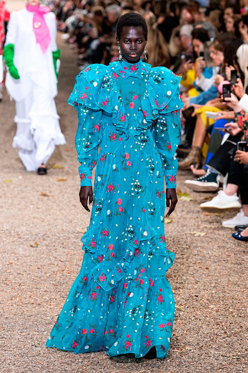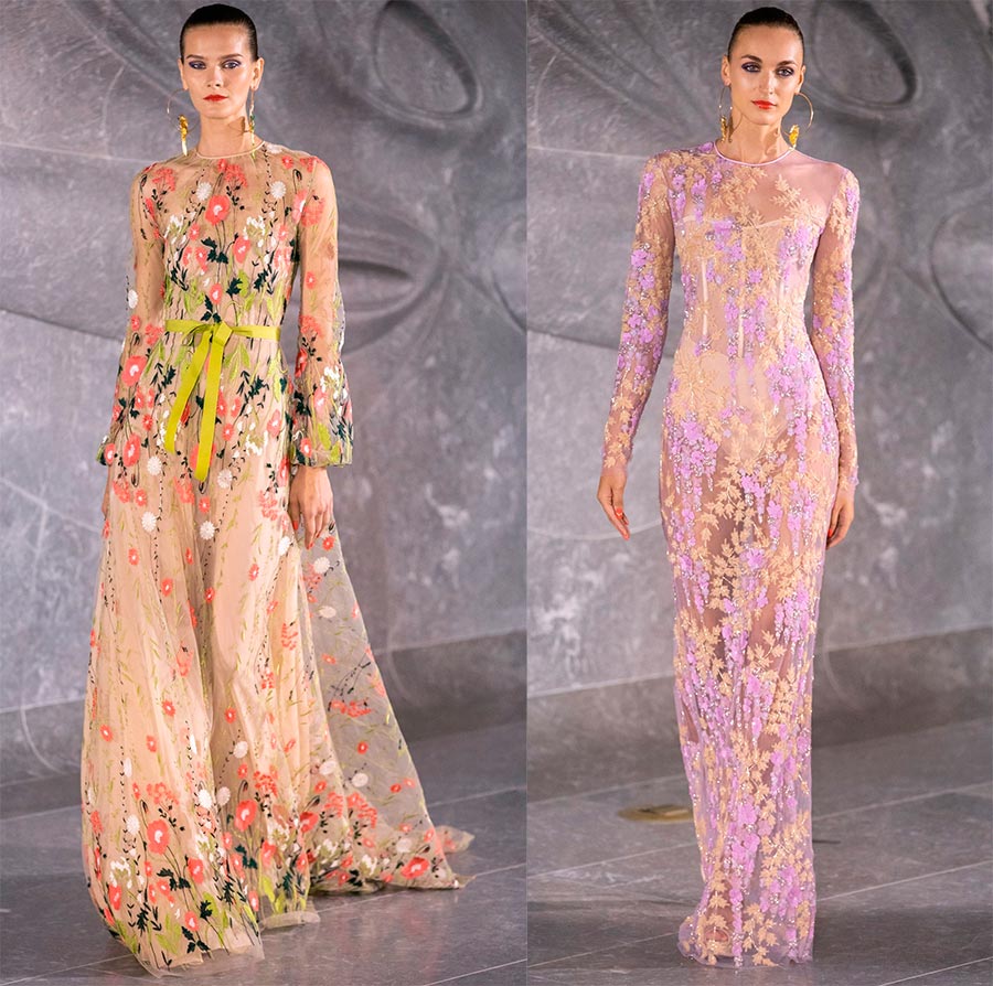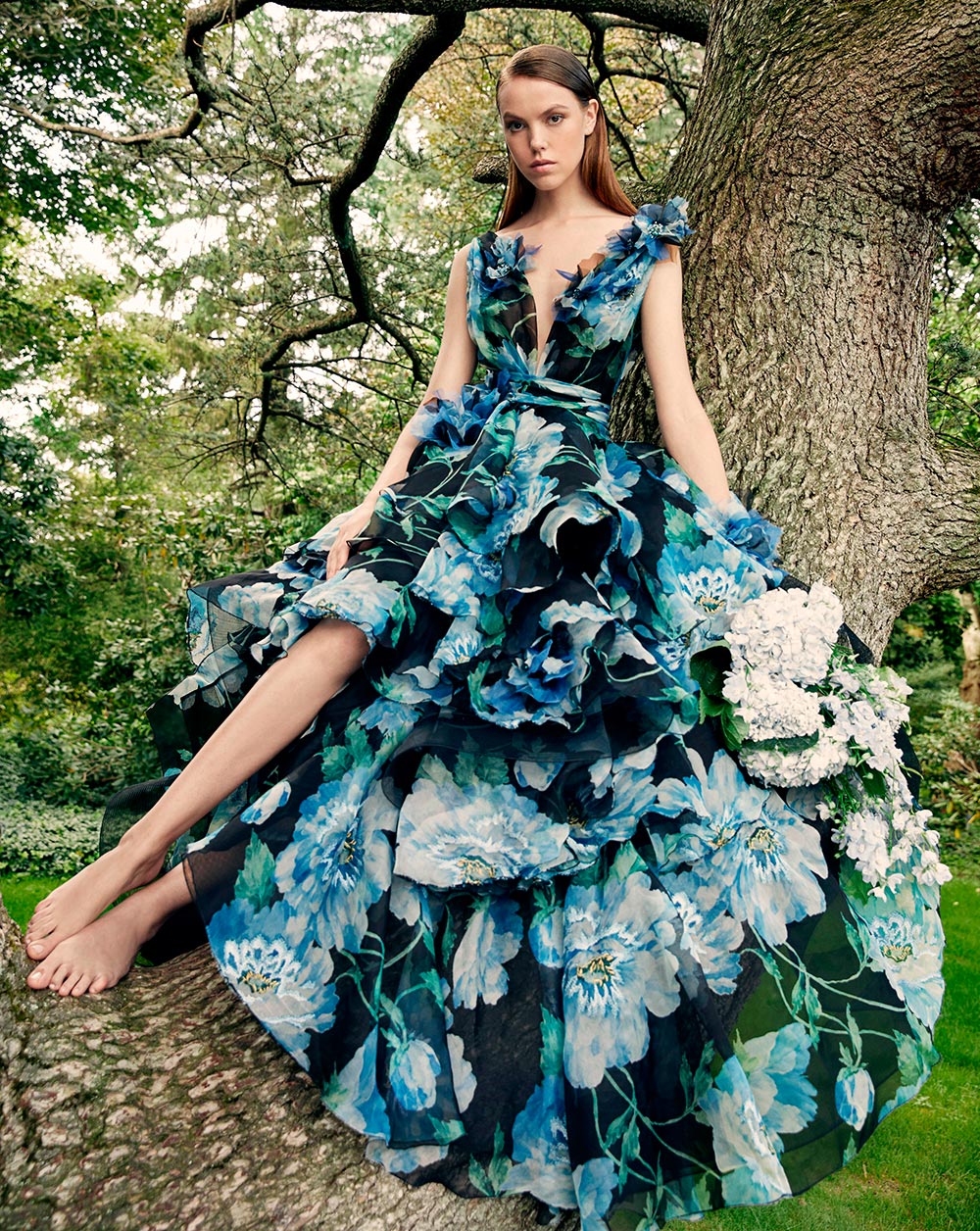 De grandes fleurs sous forme de dessins, dispersées avec désinvolture autour de la robe, ou dans des aquarelles vives floues, des pivoines pittoresques et même des roses bleues créent des images luxueuses avec leur beauté même dans la coupe la plus laconique du modèle et ornent non seulement les robes, mais aussi les costumes .