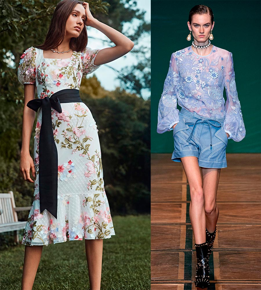 Dans les nouvelles collections, les créateurs ont combiné la broderie de fleurs avec des fleurs en 3D ou la broderie d'or avec des paillettes. Et il n'est pas du tout nécessaire que ce luxe soit sur les robes de soirée. Vous pouvez autoriser cette combinaison en combinant un short en jean ordinaire et un chemisier translucide délicat, décoré de fleurs. Les designers créent des constellations lumineuses de fleurs et de bouquets à partir de strass et de cristaux. Il existe des modèles avec un imprimé floral, entièrement brodés sur le produit.