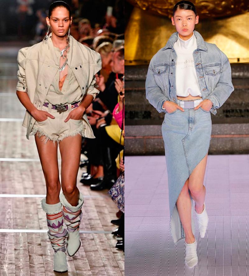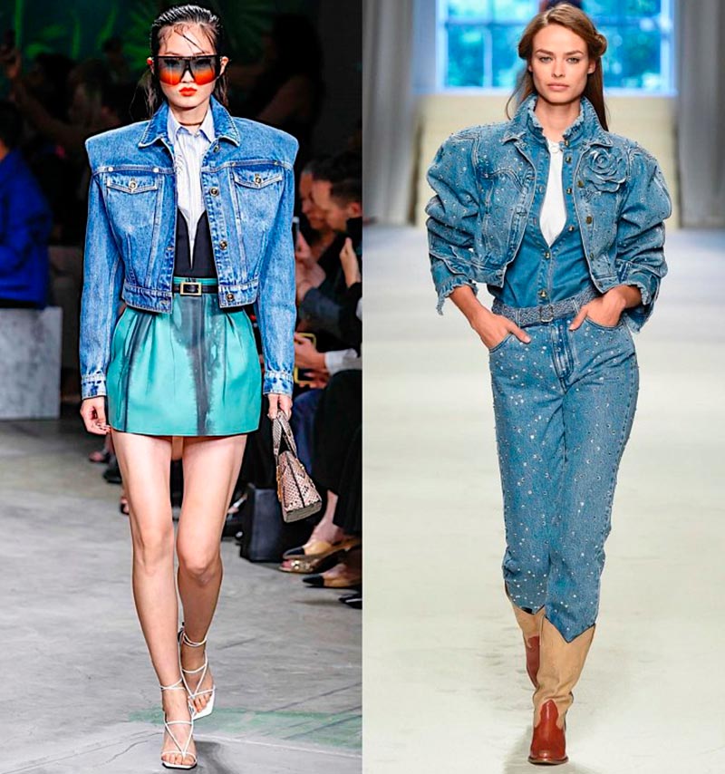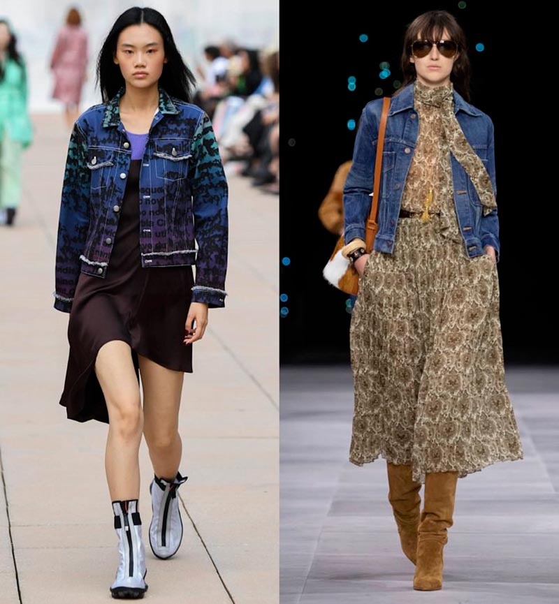 Le look total du jean est très joli, tandis que les nuances de denim pour le haut et le bas peuvent être différentes. Une veste en jean peut se porter sur un survêtement ou sur une robe romantique en mousseline, et certains créateurs (Chanel, Céline, Alberta Ferretti) suggèrent de la porter même sur un corps nu.