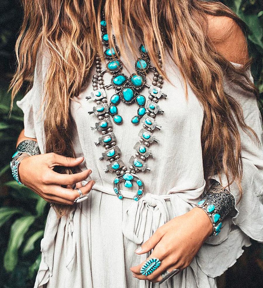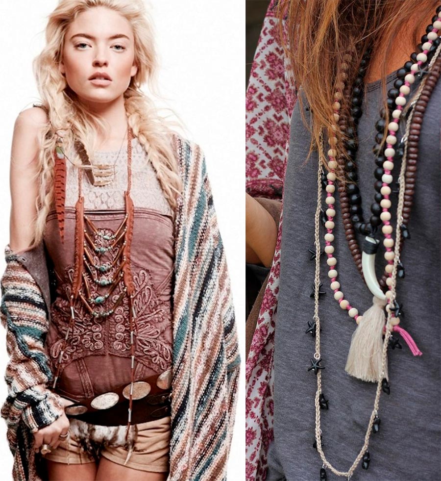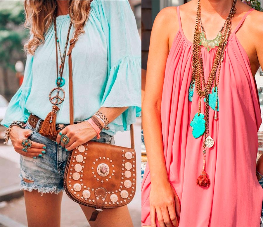 Colliers bohèmesLe style bohème chic est devenu un véritable succès en matière de bijoux de cou. Ce style ressemble un peu au style hippie des années 60 et 70 du siècle dernier. Il comprend une abondance de tissages de cuir et de textile, diverses « boules », des lacets en cuir et en caoutchouc avec des pendentifs massifs, des bijoux en pierres semi-précieuses et en minéraux naturels. Plusieurs colliers ou lacets et chaînes avec différents pendentifs ont fière allure. Assurez-vous qu'ils sont de la même couleur de métal et qu'ils correspondent également aux bracelets, bagues et boucles d'oreilles si vous les portez.