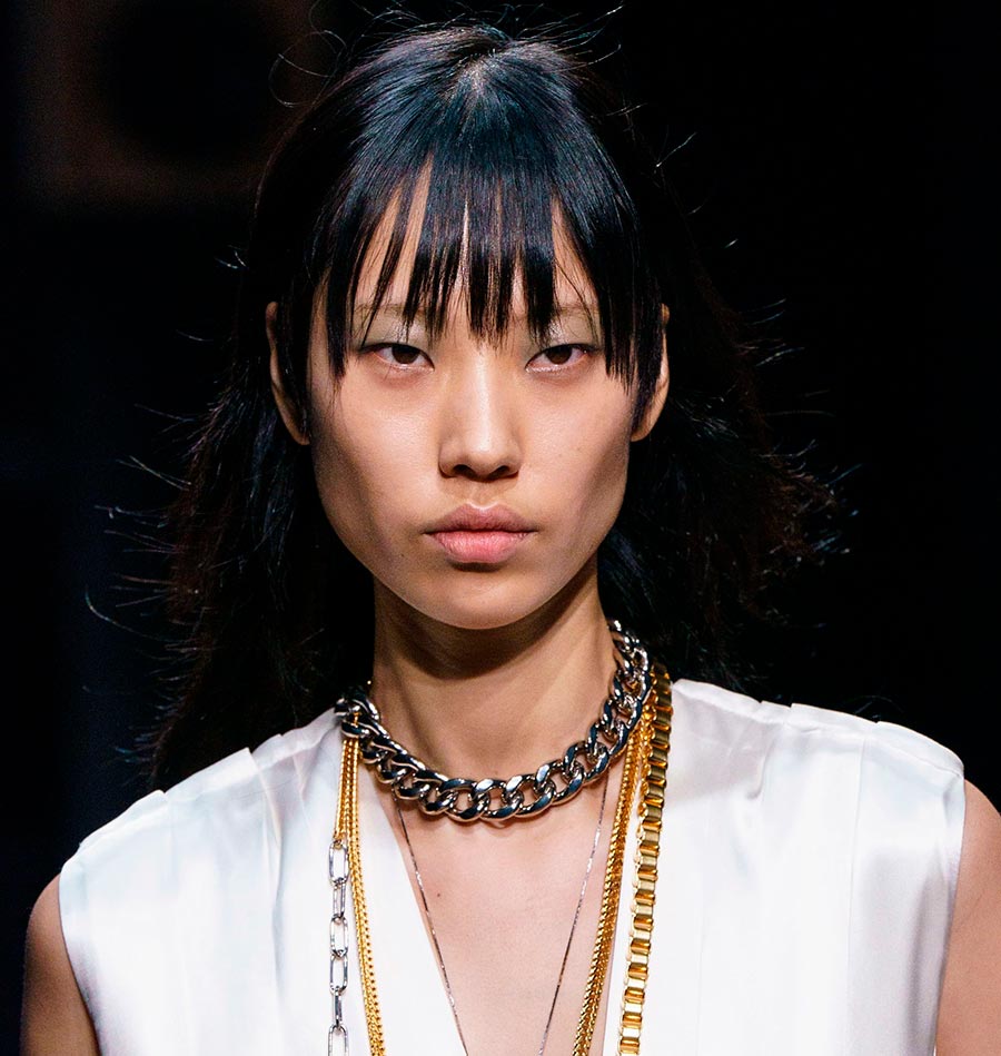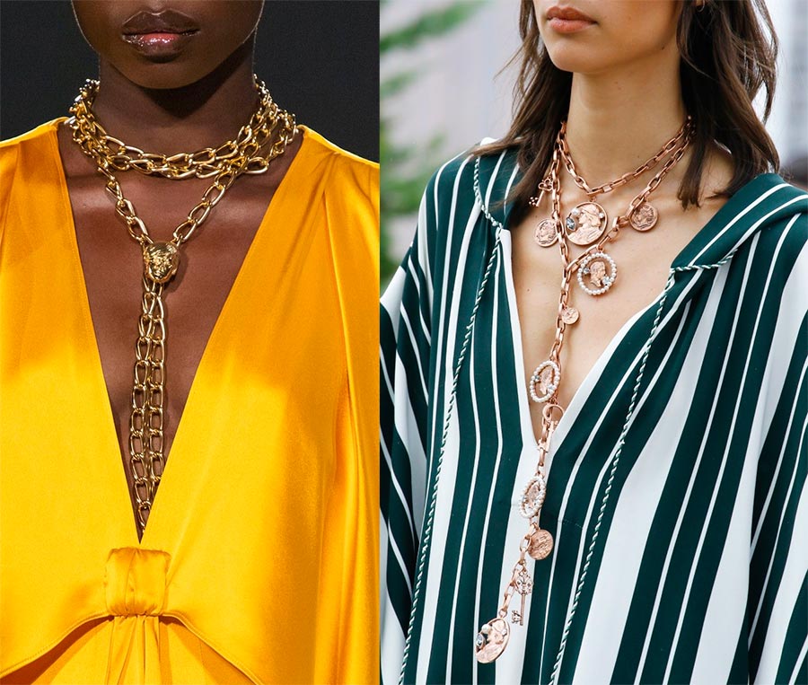 Quant aux colliers et bijoux sur le cou, la massivité et l'éclat sont aussi à la mode ici. Une abondance de colliers de différentes longueurs et de grandes tailles est encouragée.