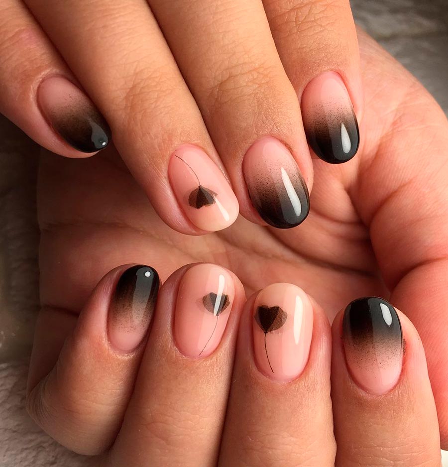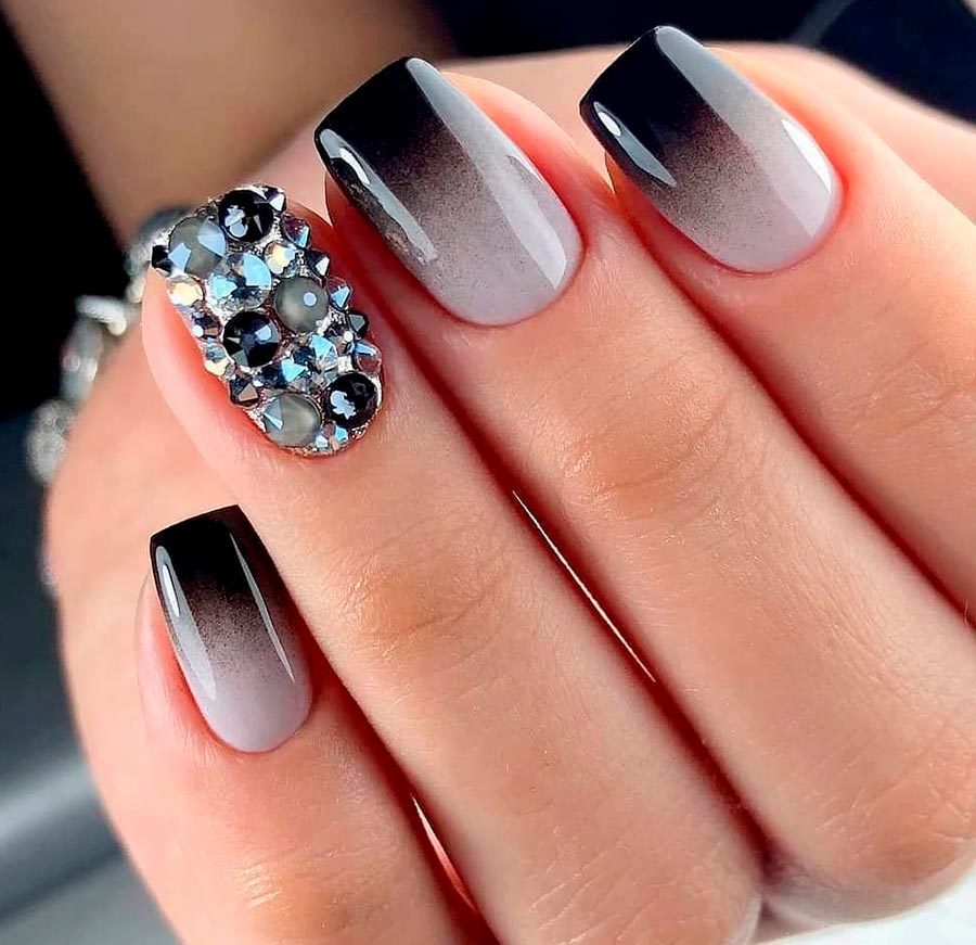 Et voici une technologie similaire, mais ici il doit y avoir une transition de couleur douce entre les nuances, même si c'est du noir et du blanc en même temps. C'est-à-dire que la transition entre eux se fera du gris foncé au gris clair. Vous pouvez peindre une belle ombre avec un aérographe même sur les ongles les plus courts et utiliser toutes les nuances.