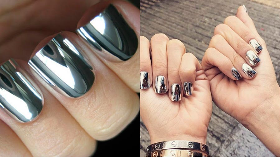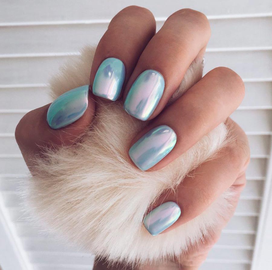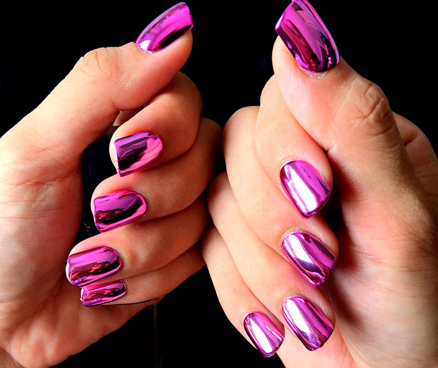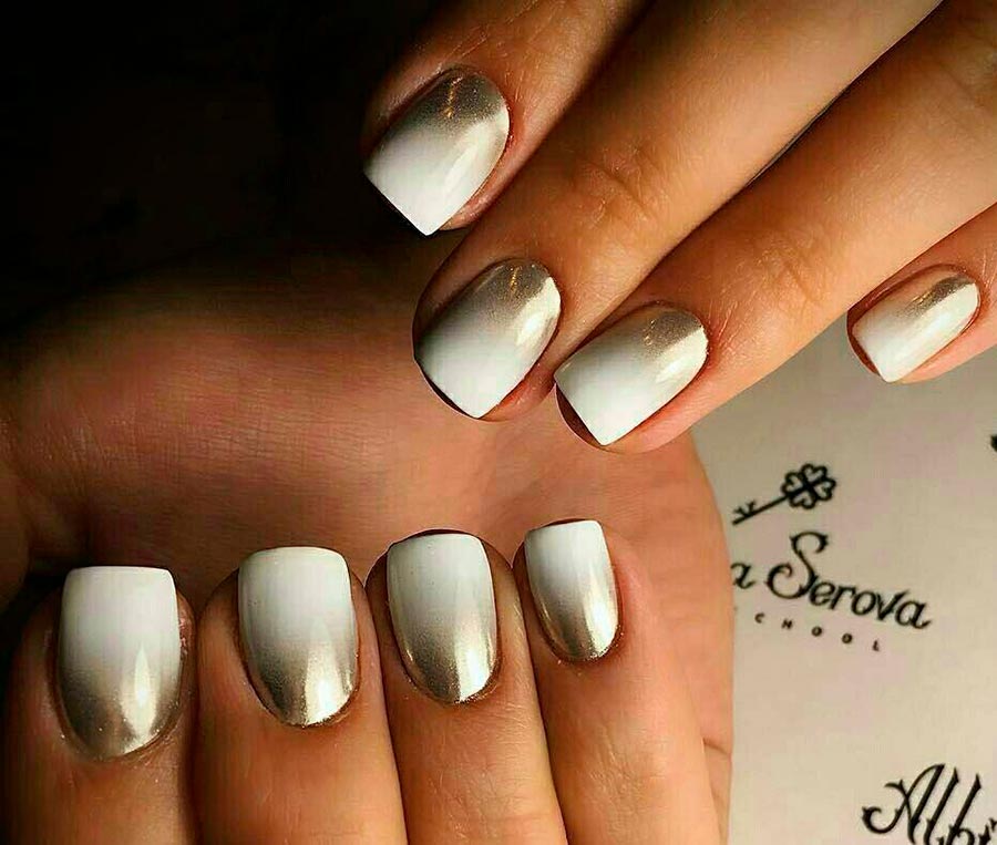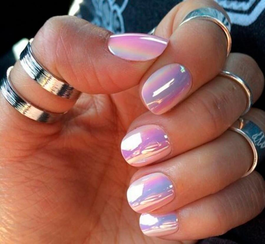L'une des tendances les plus populaires de l'année écoulée se dirige avec confiance vers 2026. La poudre miroir appliquée sur la couche de base avec du vernis donne l'effet d'une feuille ou d'un miroir. Il existe également des variantes sous forme de poudres métalliques, ainsi que des poudres de nacre et de nacre qui ressemblent au dos d'un coquillage. La poudre peut être utilisée avec des teintes claires et foncées.