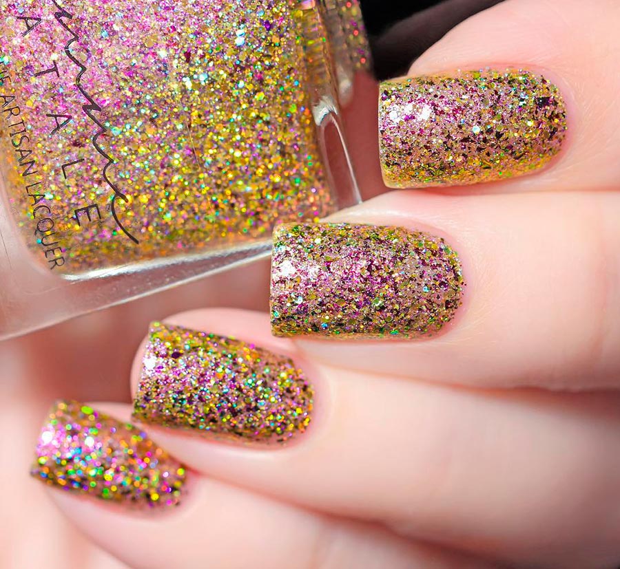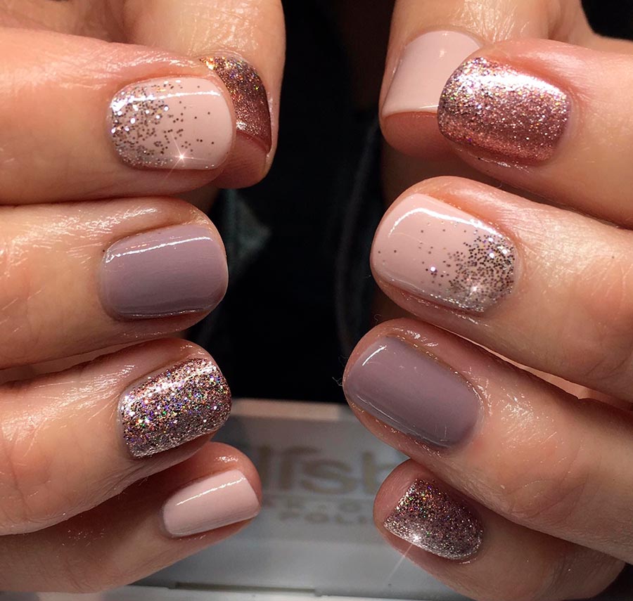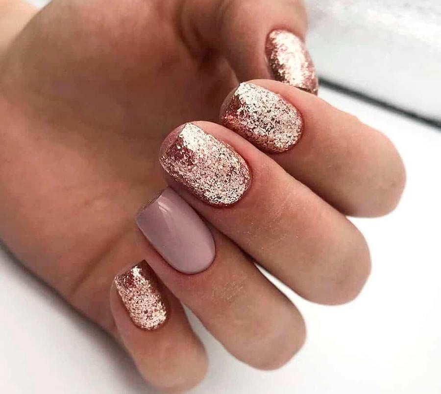 Si vous avez besoin de donner de la solennité à une manucure pour ongles courts, n'hésitez pas à utiliser des vernis et des vernis gels à paillettes et paillettes. Si sur les ongles trop longs, les paillettes peuvent sembler un peu vulgaires, alors sur les ongles courts, vous pouvez vous permettre de couvrir les 10 doigts de paillettes - c'est un avantage certain de la longueur minimale. Vous pouvez appliquer les paillettes sur plusieurs ongles ou seulement sur une partie de la plaque à ongles.