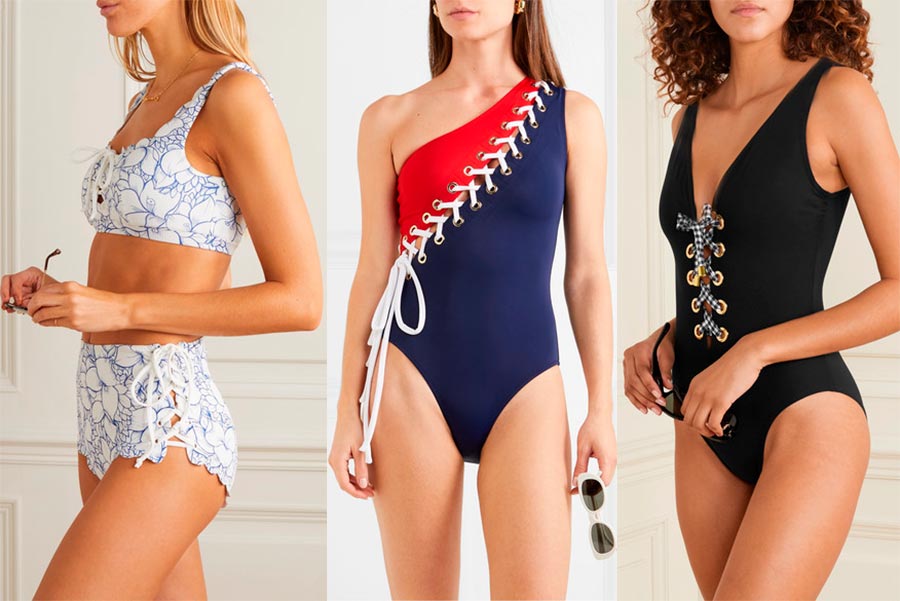 Ils continuent le thème du décor à lacets à la mode. Comme dans le cas des coupes, les designers nous proposent les options les plus originales pour l'emplacement du laçage. Des maillots de bain une pièce avec un laçage sur la poitrine peuvent être trouvés chez Karla Colletto et OYE Swimwear, des maillots séparés chez Marysia et Agent Provocateur.