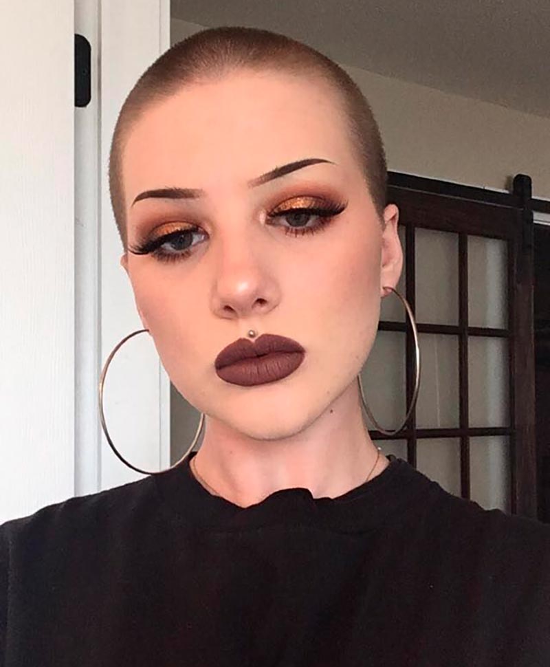 Une coupe de cheveux chauve et des coupes de cheveux très courtes pour les femmes sont idéales pour celles qui ne veulent pas perdre de temps sur la beauté traditionnelle. Une fille avec une tête chauve a l'air plus masculine et peut-être même brutale. Il est maintenant à la mode d'effacer les frontières entre masculin et féminin en tout. Les vêtements et accessoires masculins grossiers se sont installés dans le vestiaire féminin, la parfumerie s'adapte également aux nouvelles réalités.