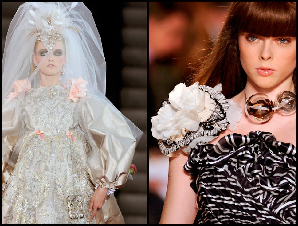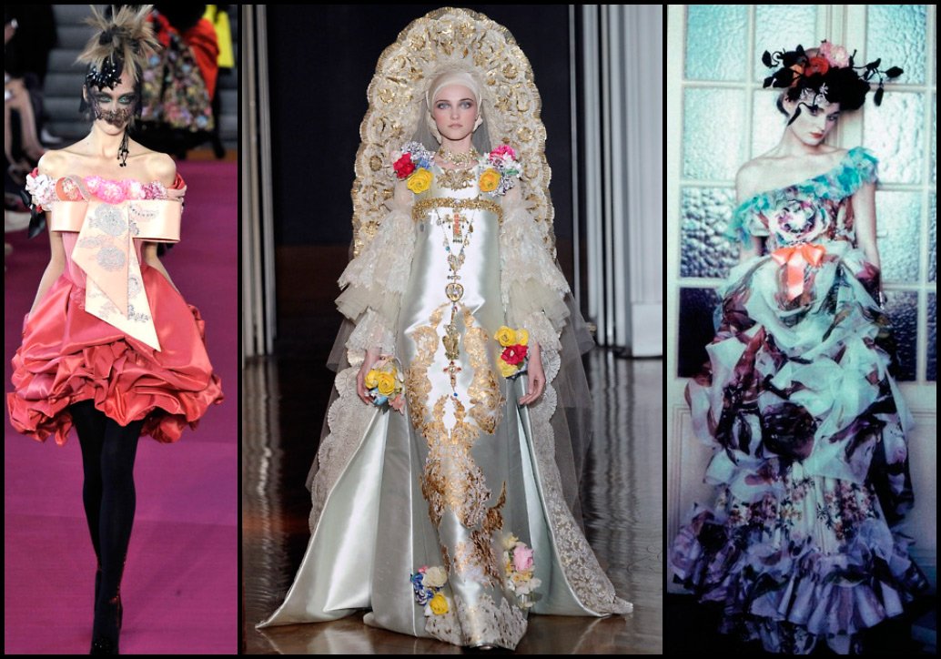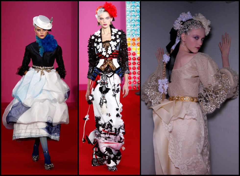 Christian Lacroix aime les combinaisons de couleurs audacieuses et lumineuses, les silhouettes pyramidales et trapézoïdales, les superpositions et reste toujours fidèle à son intérêt pour les sujets historiques. Pas étonnant que Christian Lacroix soit également engagé dans la création de costumes théâtraux, historiques. Il n'a pas non plus contourné les "motifs russes". Ainsi, en 2008, Christian Lacroix a sorti une collection qui combinait des "motifs russes", à savoir des broderies dorées et des vestes en velours, avec le style des courtisanes françaises - volant de dentelle, manches lanternes.