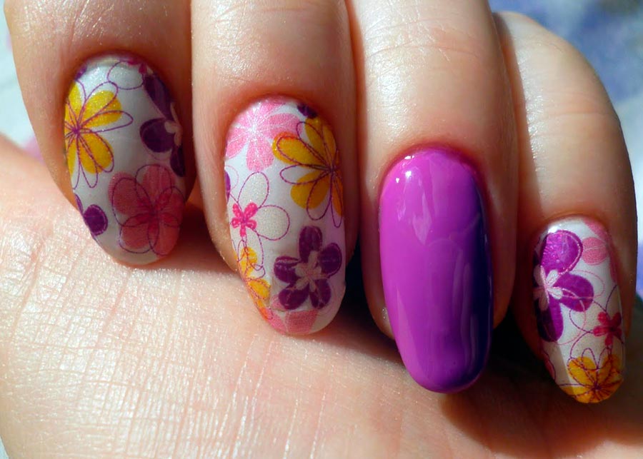 Si vos compétences en dessin ne sont pas à la hauteur, vous pouvez utiliser des autocollants floraux. Ils sont collés sur les ongles avec de l'eau, et sur le dessus sont nécessairement recouverts d'un vernis transparent ou d'un dessus pour vernis gel et séchés dans une lampe UV. Cette dernière option assurera la longévité de la manucure autocollante.
