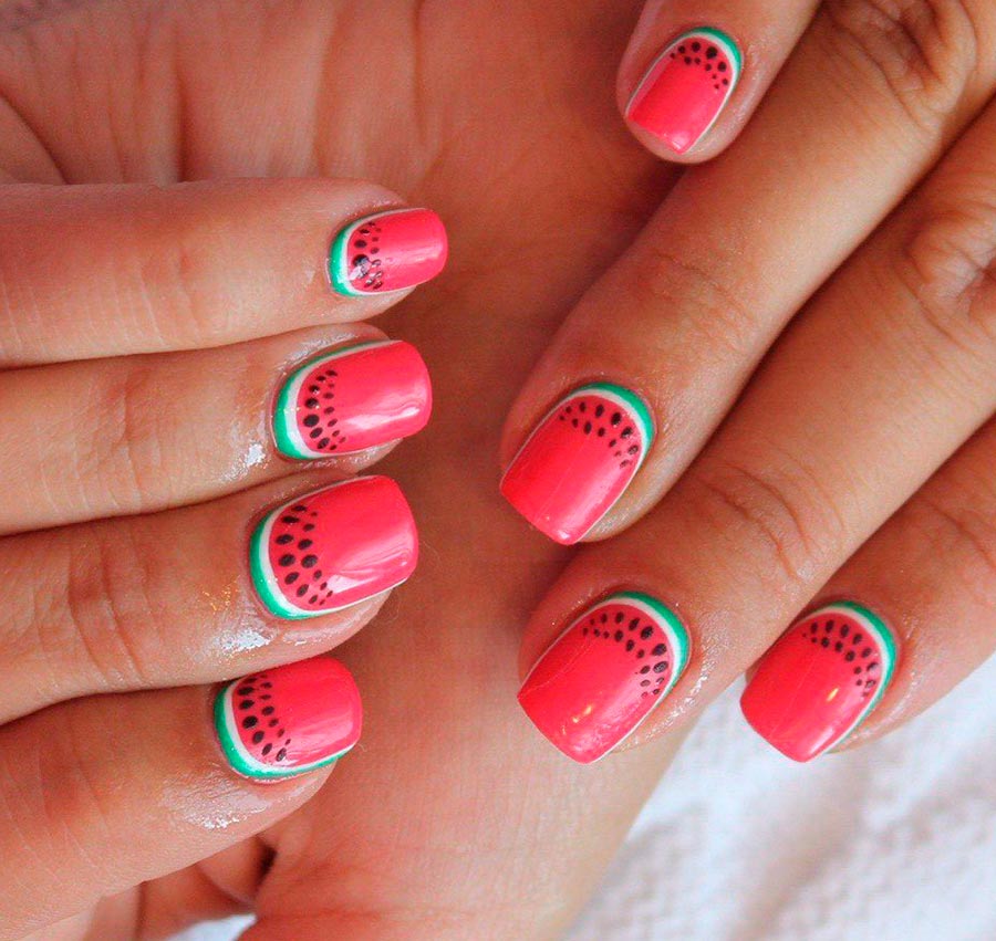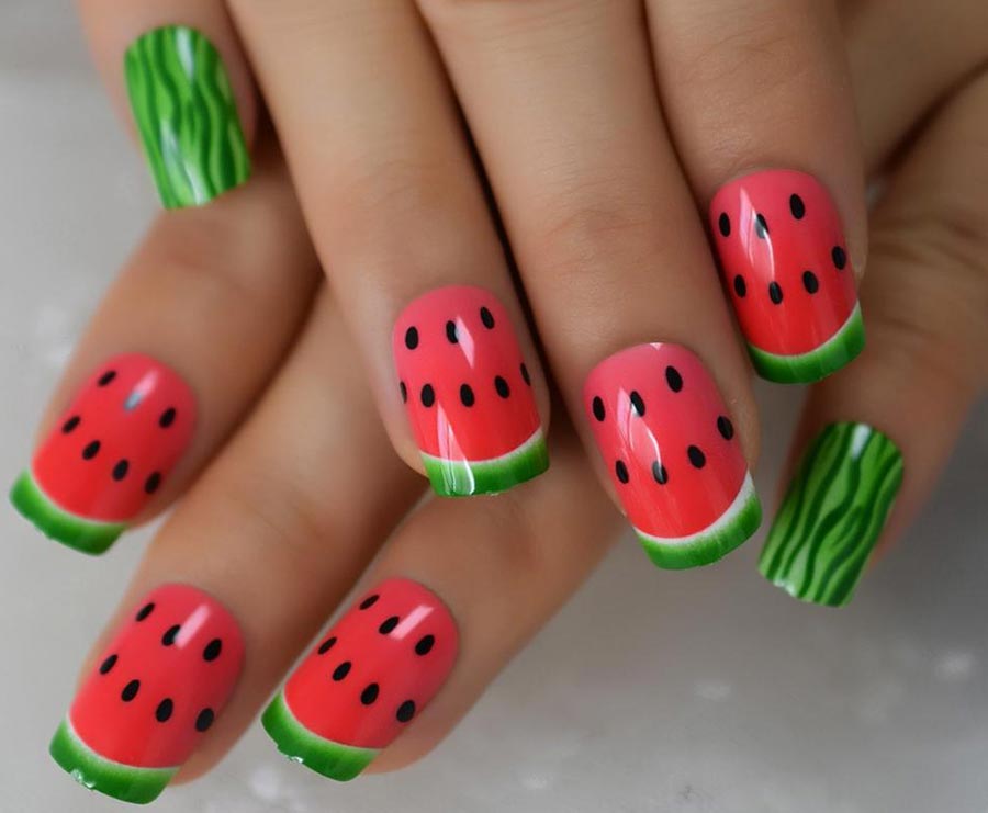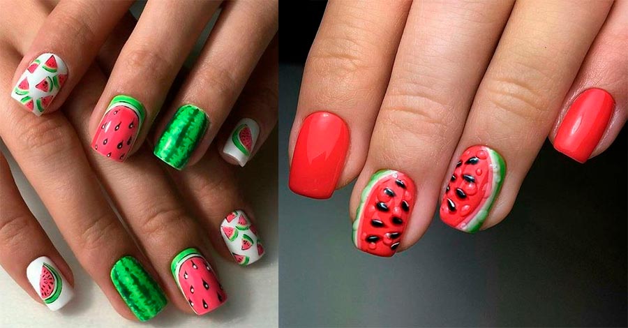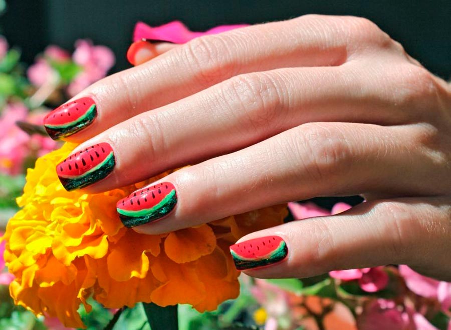 Un autre motif de pastèque, apprécié de presque tout le monde, bat des records du nombre de dessins d'ongles terminés en été. Il est très facile de le dessiner même vous-même à la maison. Une tranche triangulaire ou la moitié d'une pastèque ne nécessite que du vert, du rose et du noir.La croûte, la pulpe et les points noirs des graines, c'est tout ce sur quoi vous devez dépenser votre force et votre habileté. Mais la luminosité d'un tel design attirera immédiatement votre attention !