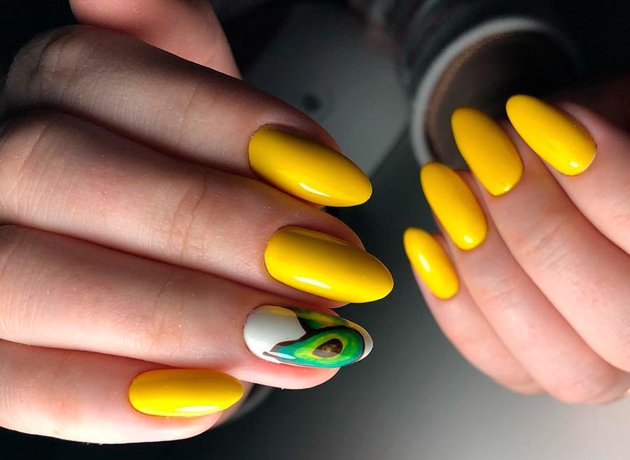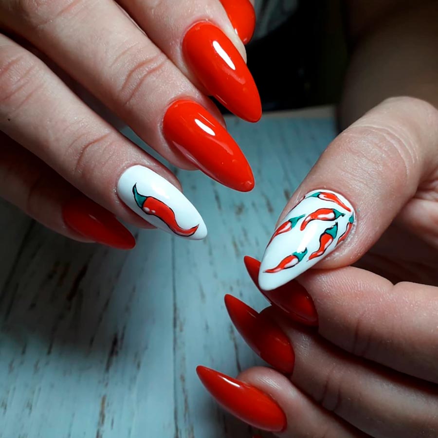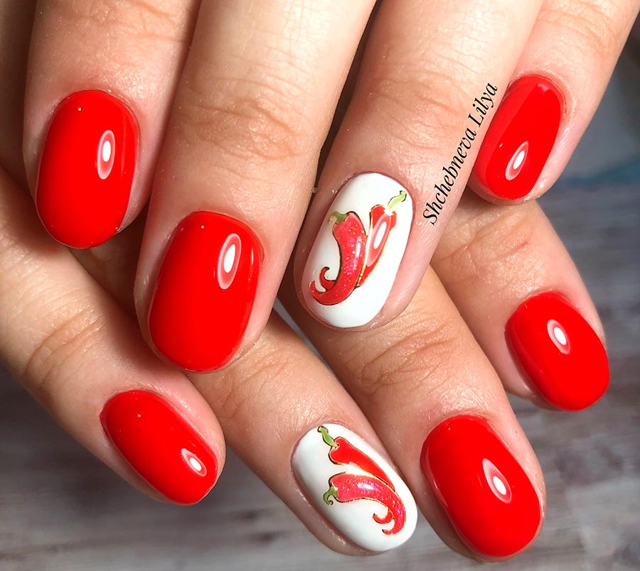 Pourquoi avec un point d'interrogation ? Parce que peu de gens veulent peindre une aubergine bleue ou une tomate mûre sur leurs ongles. Mais, néanmoins, une telle manucure est également très, très populaire en été. Quels légumes dessiner ? Oui, tout ce que vous aimez (au sens propre et figuré du terme) : les mêmes aubergines et tomates, concombres verts et piments rouges, carottes oranges et demi avocat, persil, aneth et même oignons verts !
