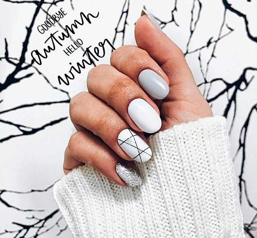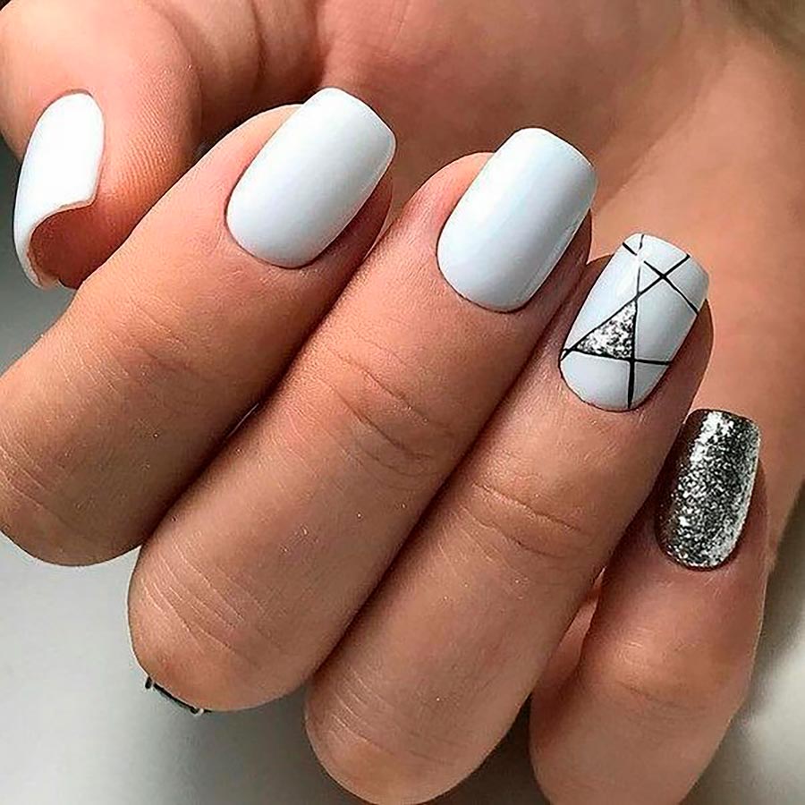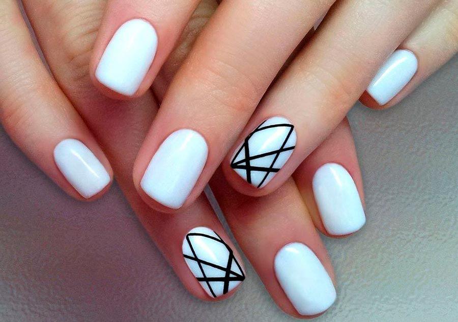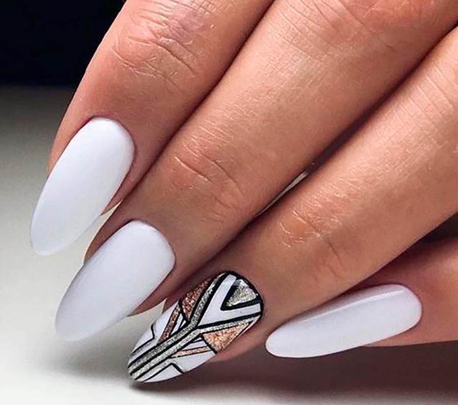 Le blanc, comme une toile vierge, est la toile de fond parfaite pour tous les motifs et ornements. Mais ce sont les motifs géométriques qui iront le mieux dessus. De plus, en 2026, la géométrie et des graphismes clairs et corrects seront pertinents comme jamais auparavant. Il existe de nombreuses options pour les motifs géométriques et les ornements. Le dessin à faire ne dépend que de vos compétences ou de votre imagination, si vous optez pour une manucure chez un maître professionnel.