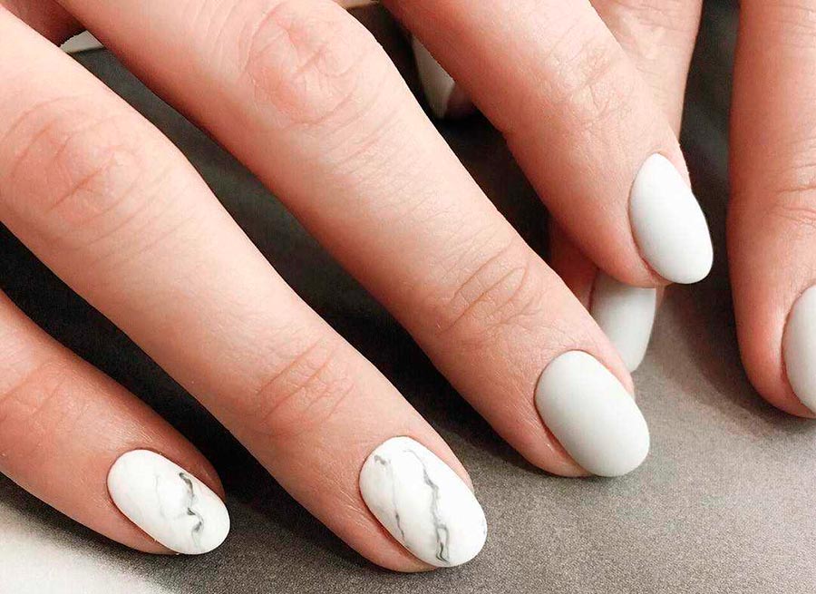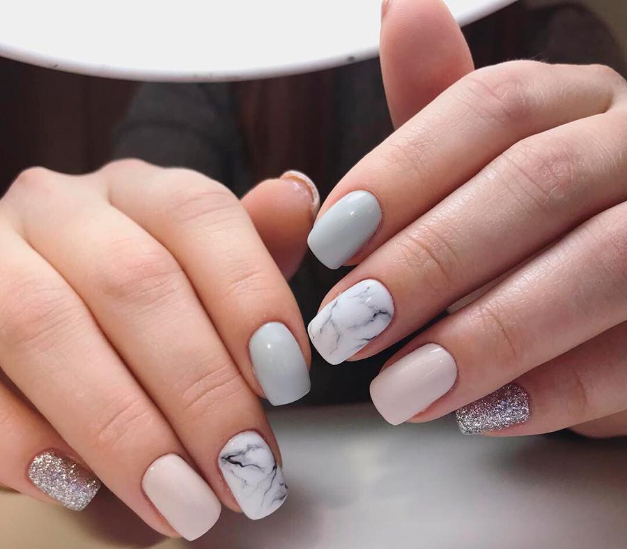 Le motif de marbre peut être imité à l'aide de stries grises et graphite, ou vous pouvez ajouter un peu de délicates « veines de marbre » beige, crème nude et chocolat au fond blanc. Regardez particulièrement bien avec des taches de marbre plus foncées entrecoupées de paillettes d'or ou d'argent. Ils ressemblent à du mica étincelant dans la taille d'une pierre et rendent la manucure plus riche et plus luxueuse.