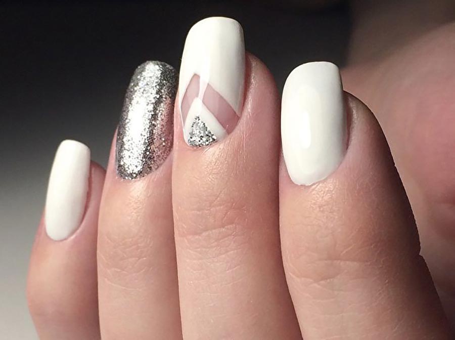 Le minimalisme laconique semble le plus réussi : un ou deux ongles sont recouverts de paillettes, et tout le reste est recouvert d'émail blanc. Mais vous pouvez également utiliser des paillettes individuelles ou des paillettes pour couvrir la base blanche. Plusieurs petites paillettes d'aluminium à la base de l'ongle sont magnifiques - ce décor peut être fait sur chaque doigt. Les strass de couleur blanche sont également bons, ils rendent la manucure plus "bijou". Mais il est préférable d'utiliser des strass de couleur pure et transparente plutôt que des arcs-en-ciel.