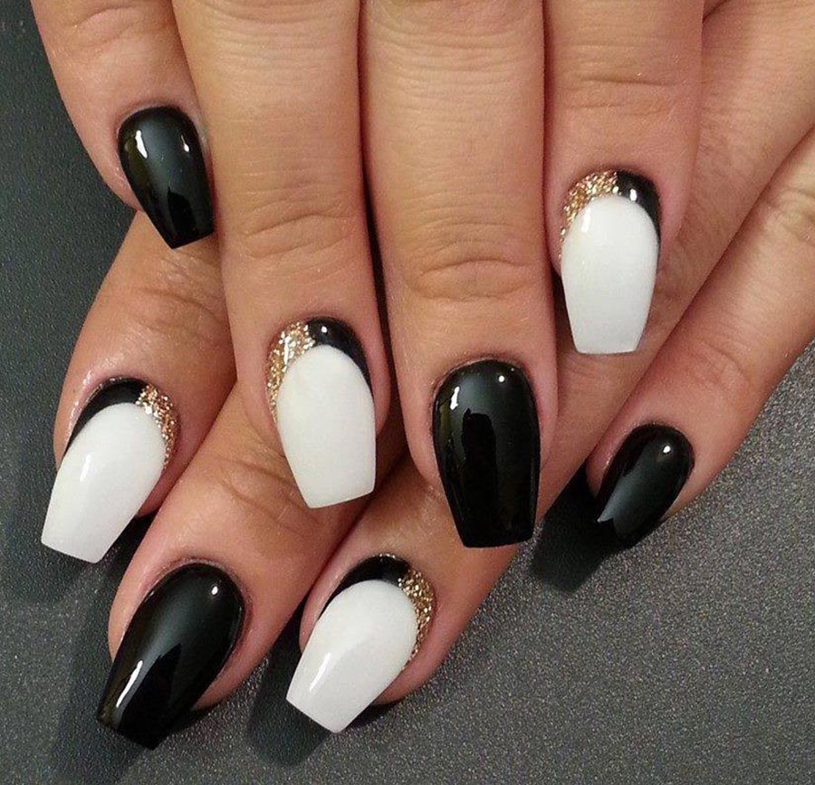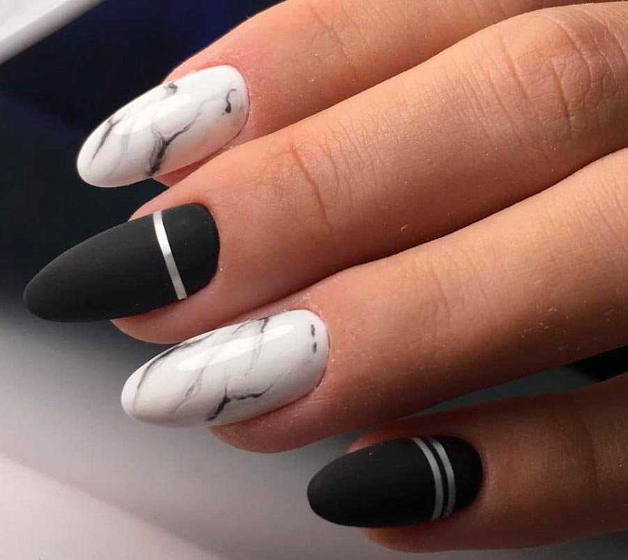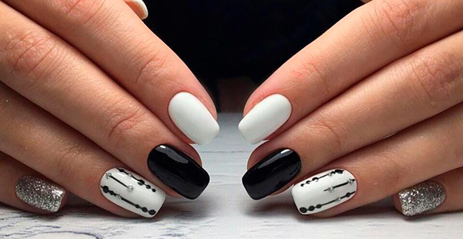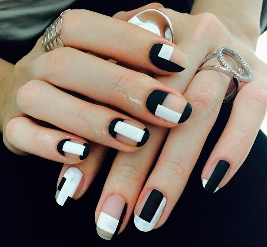 La manucure en noir et blanc est un vrai classique. C'est un gagnant-gagnant pour n'importe quel look et n'importe quel style. Les couleurs noir et blanc sont parfaites pour un style sportif, pour une entreprise et pour une promenade régulière. Là encore, la concision sera la plus réussie : ongles noirs et blancs parsemés sur toute la main. Une option plus audacieuse serait de peindre une main avec uniquement du blanc et l'autre avec uniquement du noir.