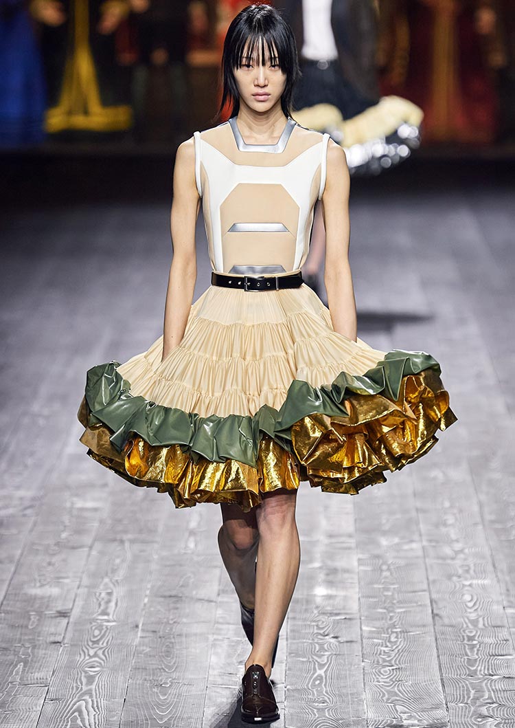 Beaucoup seront ravis que la nouvelle collection offre à la fois le luxe du passé et le design du futur, mais en même temps, presque toutes les images sont très modestes. La modestie signifie aucun élément séduisant. La fille Louis Vuitton ne veut pas être un objet de désir en matière de sexualité, elle attire l'attention avec d'autres vertus.