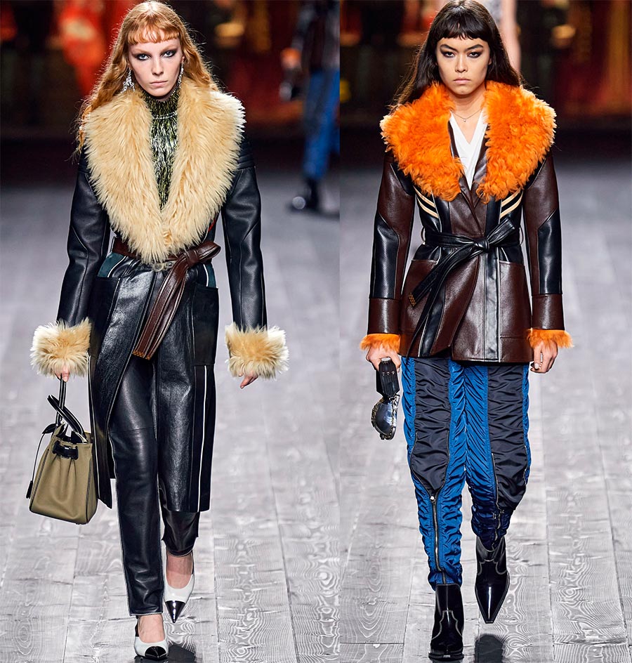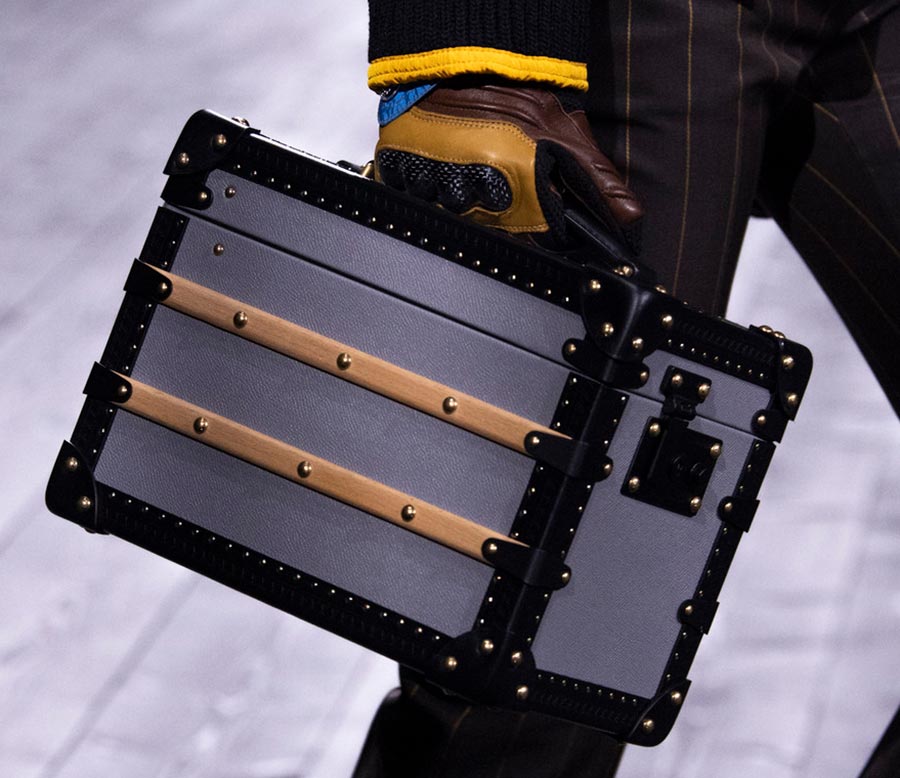 La collection Louis Vuitton est très riche en beaux gants en cuir avec empiècements en divers matériaux. La combinaison de matériaux de textures et de propriétés différentes est une tendance à la mode ces derniers temps. Grâce à la combinaison de différents matériaux, les vêtements et accessoires familiers paraissent nouveaux, parfois futuristes et technologiques.