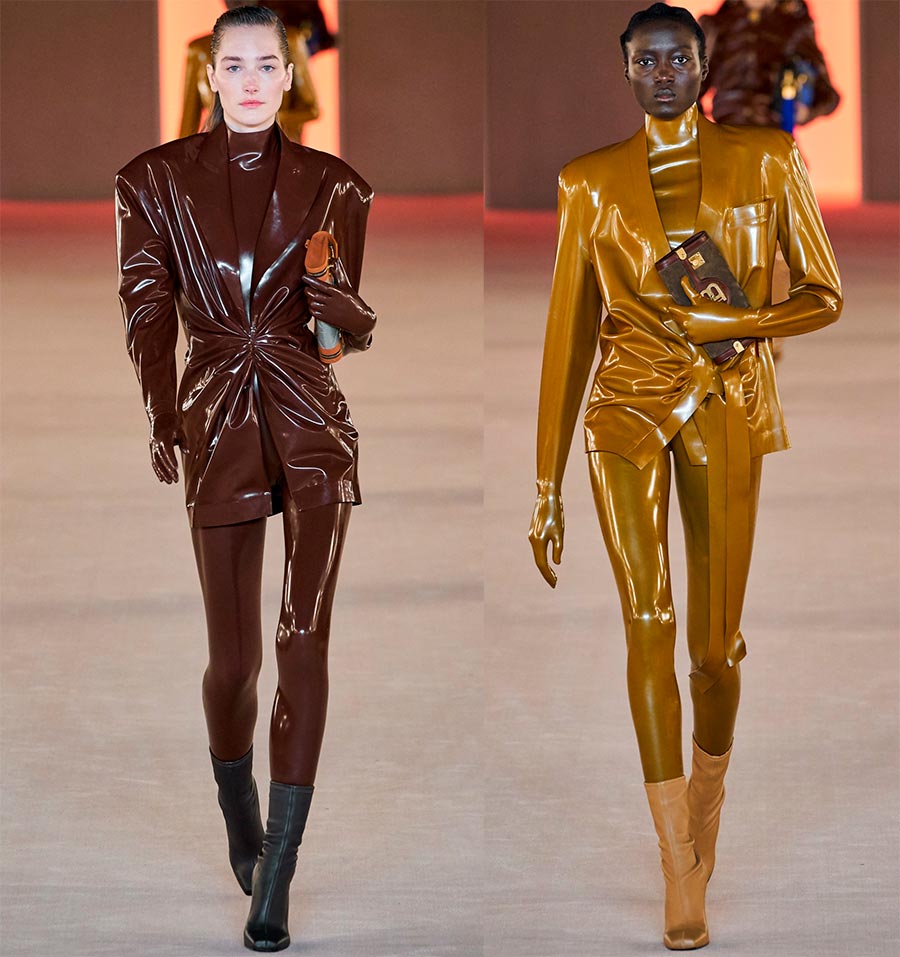 Oui, le cuir est devenu l'un des principaux matériaux. Ce sont des combinaisons pantalons élégantes, des cuissardes, des bottes assemblées, des sacs, des garnitures de costumes matelassées et, bien sûr, une variété d'accessoires. L'éclat brillant des combinaisons en latex ressemblait à une seconde peau...