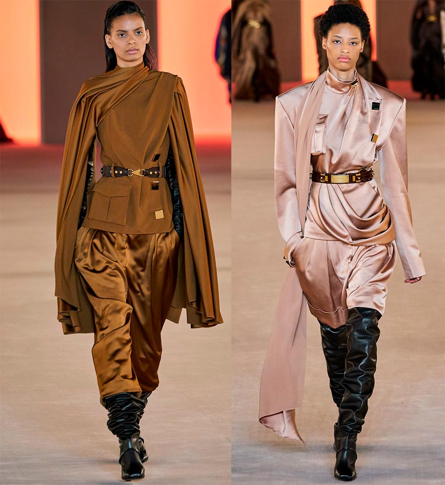 Le designer a utilisé une grande variété de matériaux, et beaucoup d'entre eux ont été harmonieusement combinés. Des ensembles de cuir, PVC, latex, denim, velours sont apparus sur le podium, dont les nuances s'intègrent parfaitement dans la gamme brun sable.