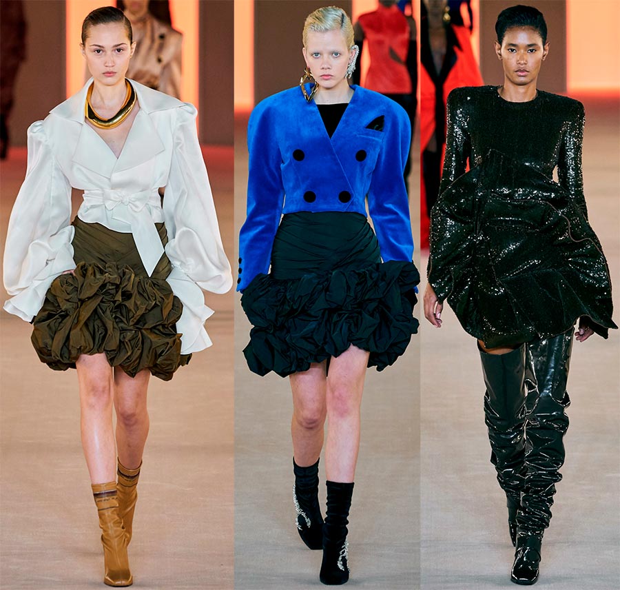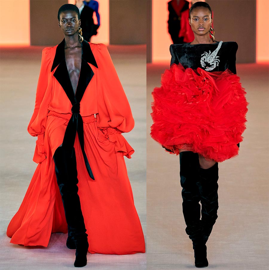 Les robes en soie aux drapés magnifiques et complexes méritent une attention et une admiration particulières. Malgré l'idée du créateur de montrer une femme forte et confiante, Olivier Rousteing laisse toujours sa féminité et son romantisme inhérents. Et cette douceur de la collection s'incarne dans des matières douces, soyeuses et légères.