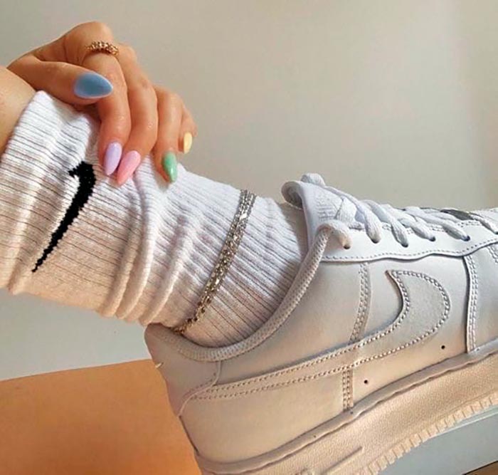 Bracelets sur la jambe... Cet été, ce sont les chaînes massives qui seront aux pieds de toutes les filles. Une telle décoration d'accent est idéale pour rendre un look laconique plus lumineux et plus à la mode. Glissez une grosse chaîne sur des chaussettes griffées (autre tendance) avec des baskets pour un sport chic. ou des chaînes plus délicates avec des sandales et des robes délicates pour rehausser le style pour un look romantique.