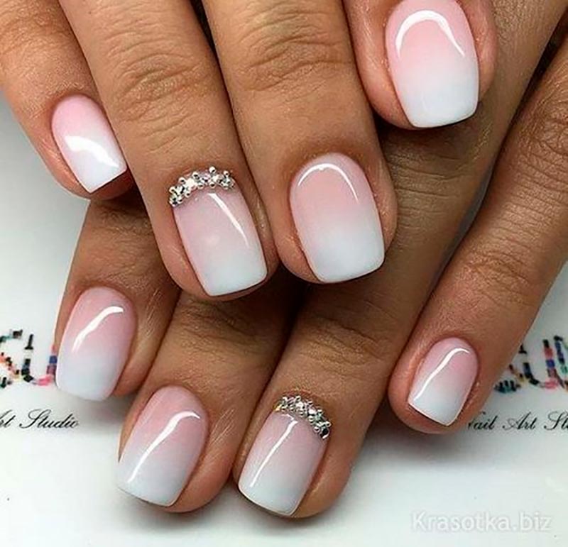 Une alternative à la veste traditionnelle est un ombre nude avec une transition d'une couleur plus foncée à une couleur plus claire. Dans le même temps, il est recommandé d'utiliser des nuances naturelles pour la couleur de base ou une base complètement transparente. Les teintes beige, crème, rose et lavande conviennent bien. Mais pour le bout de l'ongle, bien sûr, nous choisissons une couleur blanche comme neige brillante. Il s'agit d'une variante de la manucure française, mais sans "sourire" clairement défini, mais avec une transition douce et douce.