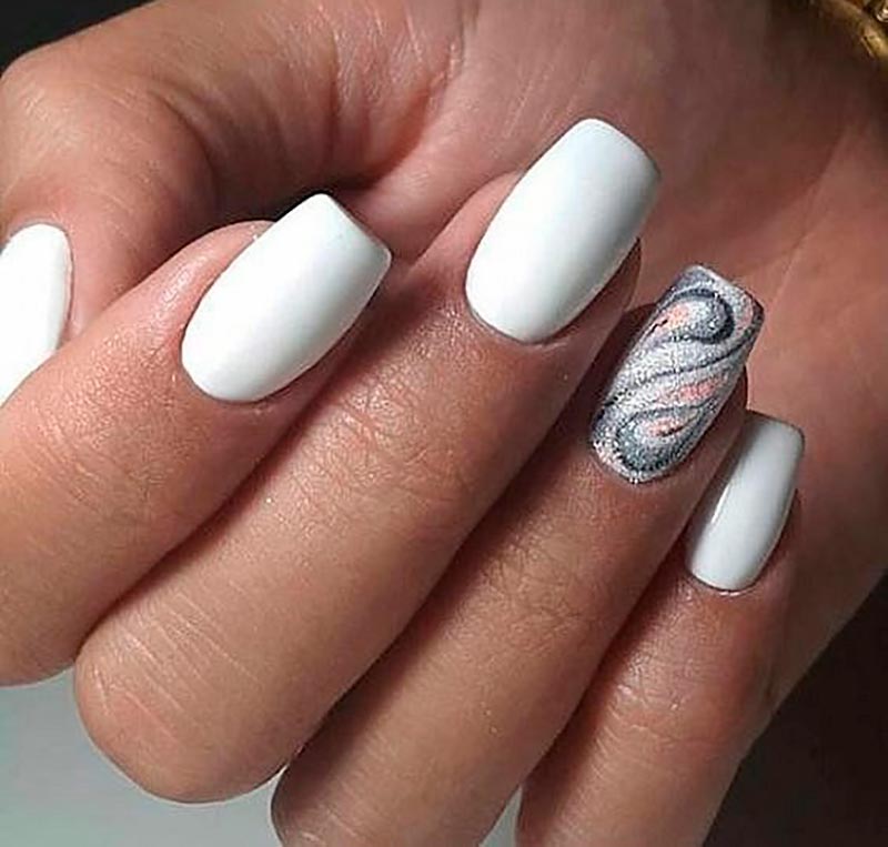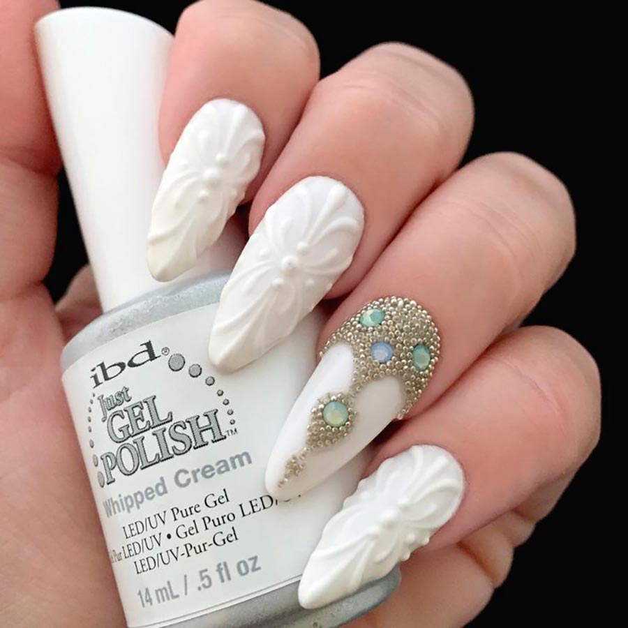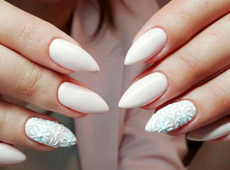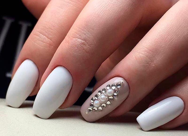 Le blanc est un classique pour un mariage, comme nous l'avons dit plus haut. Et il est choisi non seulement pour une robe de mariée ou un bouquet de mariée, mais aussi pour une manucure. Ongles d'un blanc pur - quoi de plus concis et soigné ? La plaque à ongles, entièrement recouverte d'une base blanche, crée une sorte de toile sur laquelle vous pouvez dessiner tout ce que vous voulez ou ajouter des détails intéressants au design.