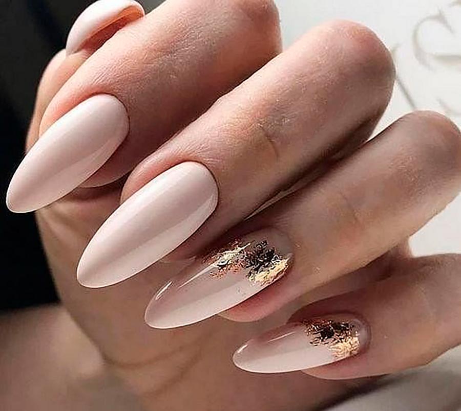 C'est particulièrement bien si la couleur du vernis à ongles en gel correspond à la teinte de la robe de mariée. Autrement dit, si la robe n'est pas blanche comme neige, mais crème avec une teinte dorée, choisissez des tons beige et caramel pour la manucure. Si la robe est rosâtre - rose, si argentée - lavande, etc. Les ongles recouverts de vernis gel léger émail doivent être créés dans une forme parfaite, quelle que soit leur longueur.