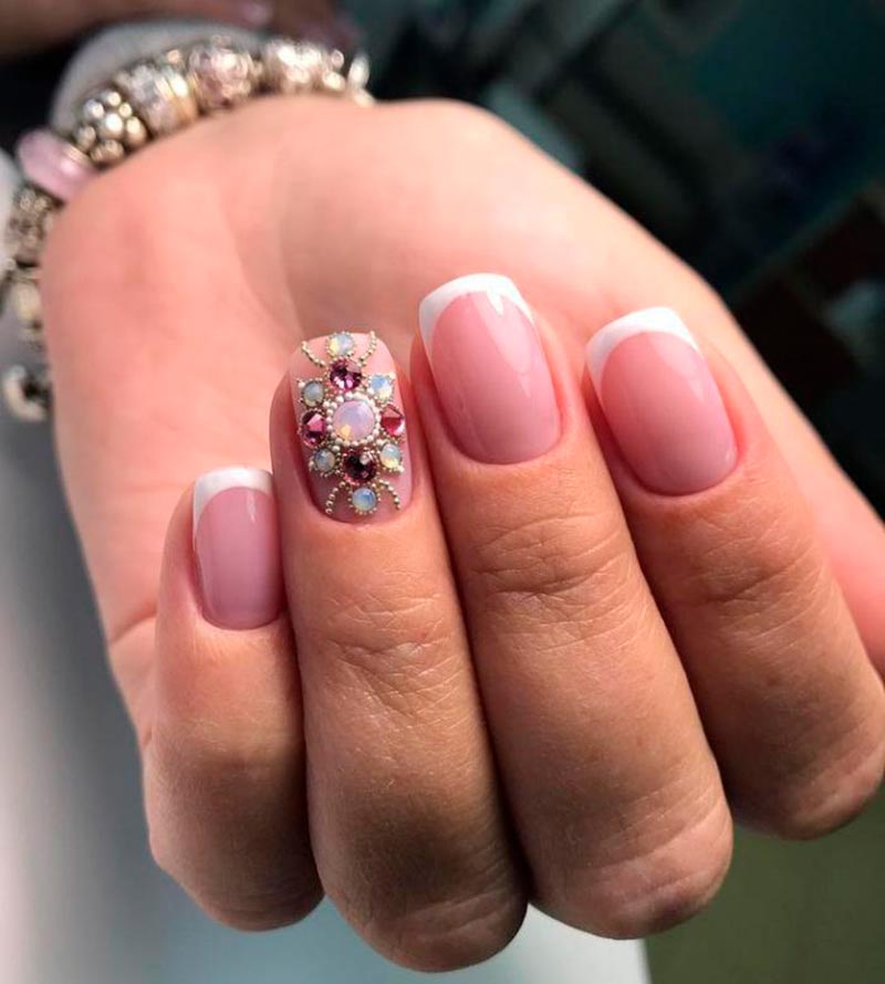Les strass, les pierres et les paillettes sont un élément traditionnel de la manucure pour une occasion festive. Et ils peuvent être très pertinents juste au mariage. Pour les mariées audacieuses et lumineuses, vous pouvez choisir une manucure pétillante et irisée avec un design de strass et de paillettes sur chaque doigt. Si vous voulez plus de tendresse et de retenue, décorez un seul ongle de pierres. L'alliance se pose à l'annulaire, et c'est dans ce cas qu'il est recommandé de la décorer de paillettes.