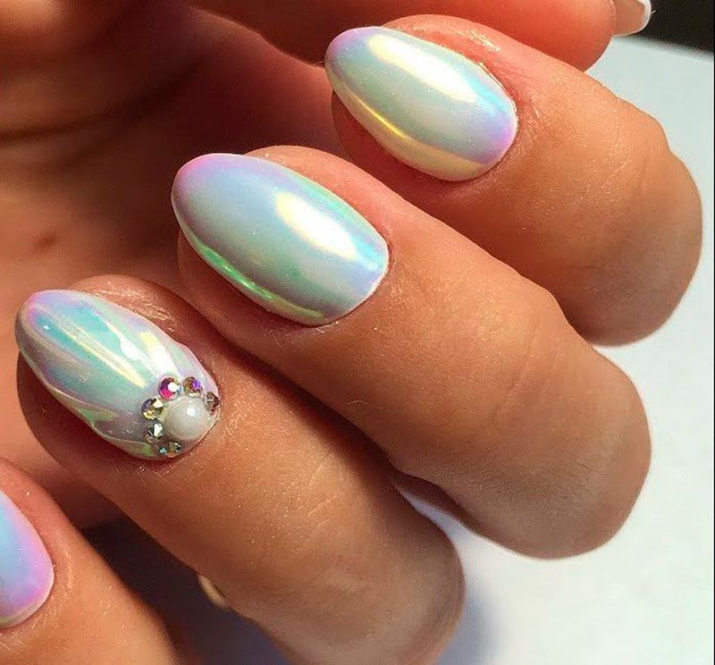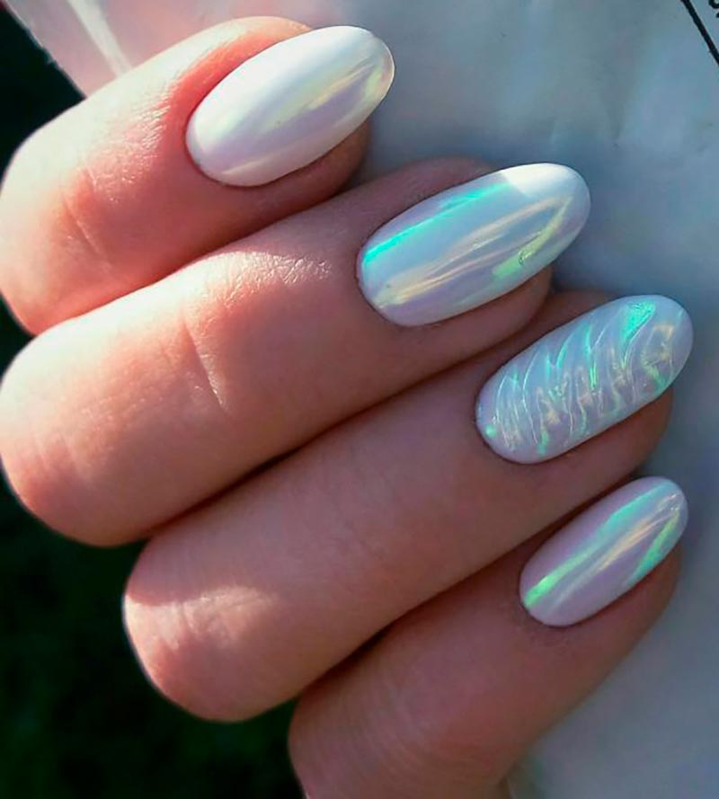 Pour éviter que les ongles d'un blanc pur n'aient l'air trop simples, ils peuvent être recouverts d'un dessus mat, d'une poudre de velours ou d'un enrobage de sucre. Mais encore mieux, à notre avis, le frottement nacré aura l'air sur du blanc. Choisissez un gommage à la poudre avec une texture légèrement translucide et une délicate brillance nacrée. Les frottements miroir pour une base blanche ne fonctionneront pas ; ils ont fière allure sur des teintes sombres saturées.