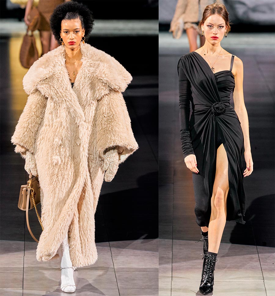 Et, néanmoins, voyons d'abord quels nouveaux looks ont été préférés par les créateurs célèbres de la saison automne-hiver. Pour la collection 2026/2021, Dolce & Gabbana a présenté des tricots chauds et douillets. Ici, vous verrez des cardigans, des pulls avec de grandes « tresses », des robes avec un motif simple laconique ou une dentelle délicate, des looks d'alpaga doux, de longues écharpes à franges, des mi-bas en laine et même des sacs en tricot. Presque toute la collection a été conçue dans une palette de couleurs noires.
