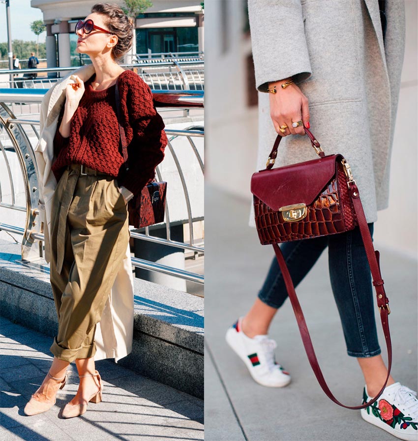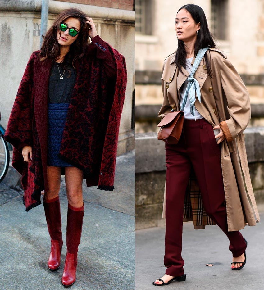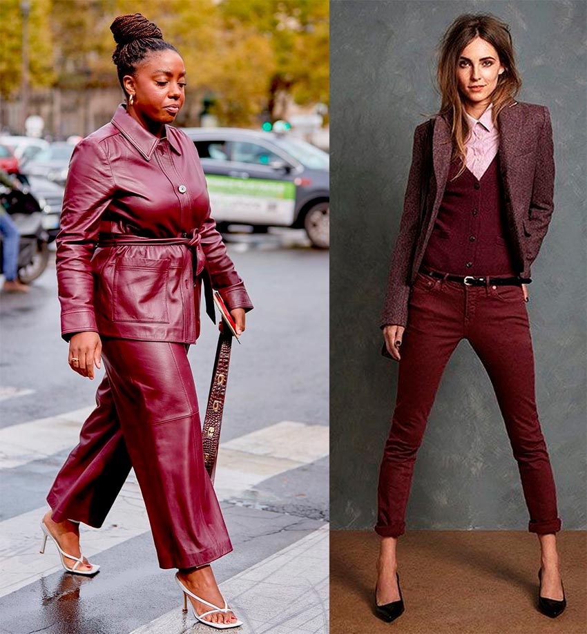 Pantalons, jupes, fourreaux, pulls, vestes, manteaux et, bien sûr, une abondance de cuir, à la fois mat et brillant - c'est pour cela que cette teinte semble être créée. Et oui, il se marie bien avec des tons nude et beige, avec du gris, du noir et même du bleu.