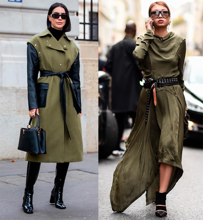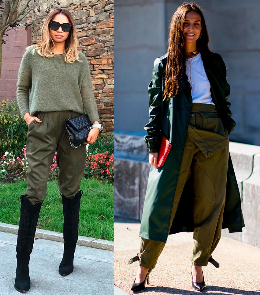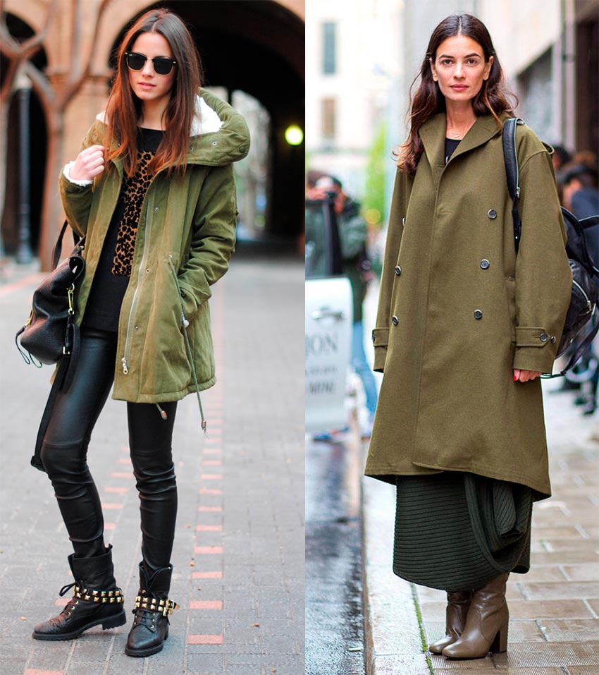 Parkas, manteaux, vestes, tailleurs pantalons, jeans et jupes, et plus encore... robes en soie, voire robes de soirée - c'est ici que vous pouvez utiliser la teinte kaki. Il se marie très bien avec le gris et le chocolat, le bordeaux et le beige, et même l'orange poudré et clair.
