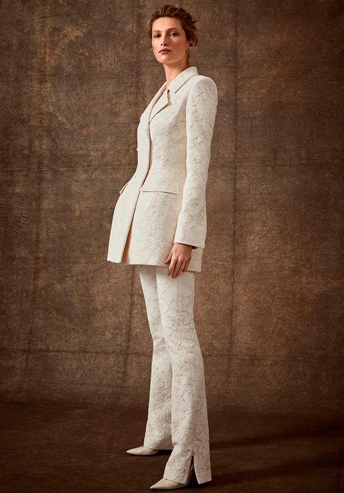 Ainsi, un tailleur-pantalon de couleur blanche ou laiteuse est transféré d'une garde-robe professionnelle à une garde-robe de mariage. De plus, sur l'image, d'autres options pour le bas peuvent être utilisées - une minijupe, un maxi ou même un short. Suzanne Neville, Cushnie et Ochs, Danielle Frankel, Roland Mouret - ont présenté dans leurs collections des options de robes de mariée dans un nouveau look inhabituel.