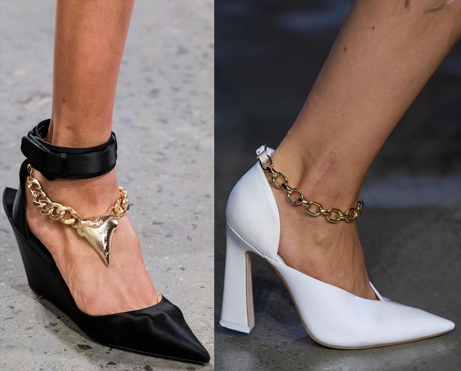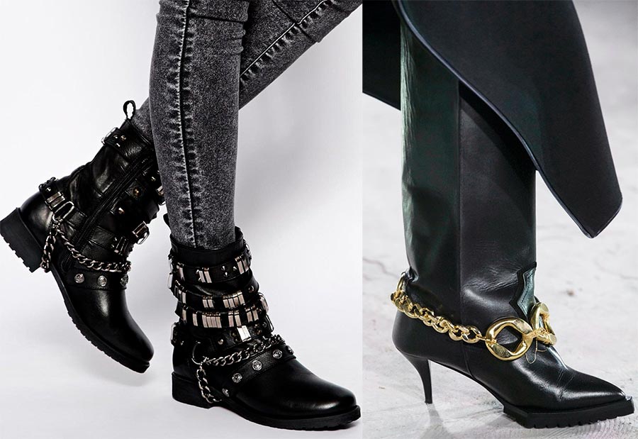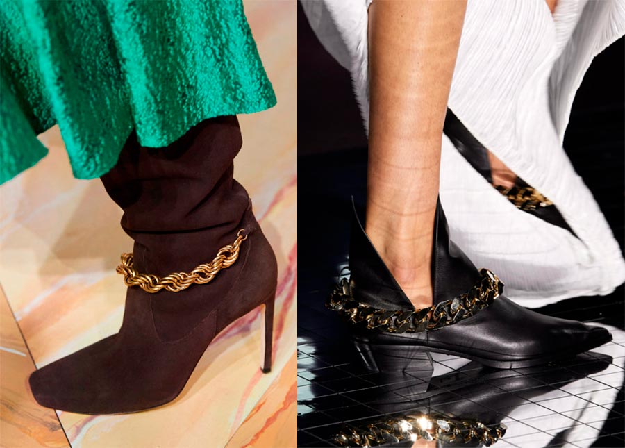 Pour des escarpins gracieux et des bottes sophistiquées, vous pouvez choisir le décor sous la forme d'une abondance de fines chaînes autour de la cheville. Les chaînes peuvent fonctionner comme une sangle de chaussure, et sur de nombreux modèles, elles peuvent être retirées si vous le souhaitez. Sur les bottes et les bottes, il y a des chaînes épaisses plus grossières et plus massives de métal miroir brillant en blanc ou jaune, argent ou or. Lorsque vous choisissez des chaussures avec des chaînes, assurez-vous qu'elles correspondent à la couleur du métal avec le reste des garnitures métalliques de vos vêtements et accessoires.