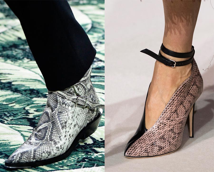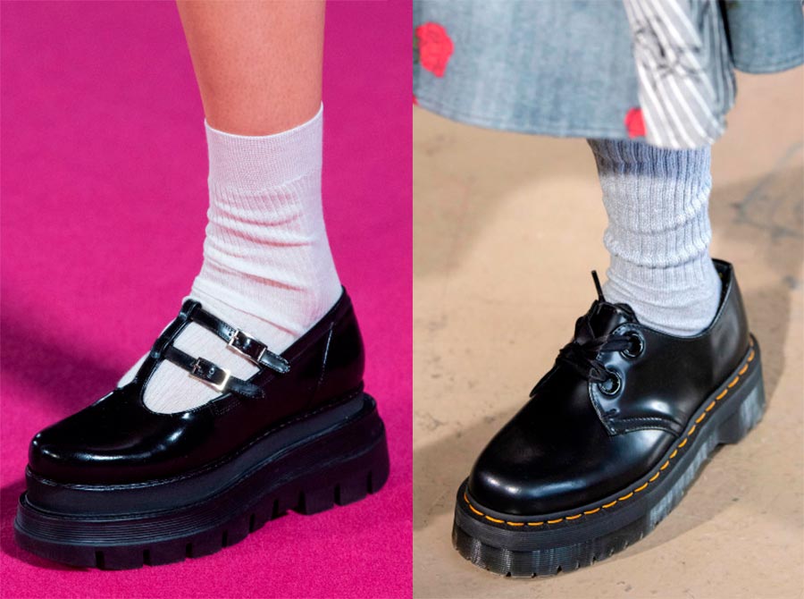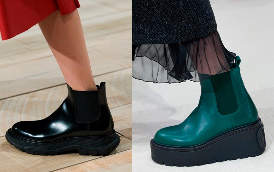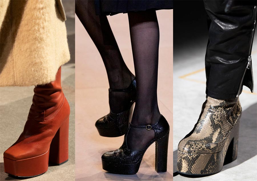 La marque Céline proposait des chaussures gracieuses avec des talons hauts mais stables et une plateforme séparée. Certaines options ont été réalisées dans des classiques en noir et blanc sobres avec une texture de reptile, tandis que d'autres ont été satisfaites d'une plate-forme de tracteur aux couleurs contrastées. Les designers Philosophy de Lorenzo Serafini et Dries Van Noten ont suggéré de porter des bottes hautes à talons larges et à plateforme haute, et Alexander McQueen et Valentino - des bottines Chelsea pratiques jusqu'à la cheville avec une plateforme presque sans chute de hauteur.