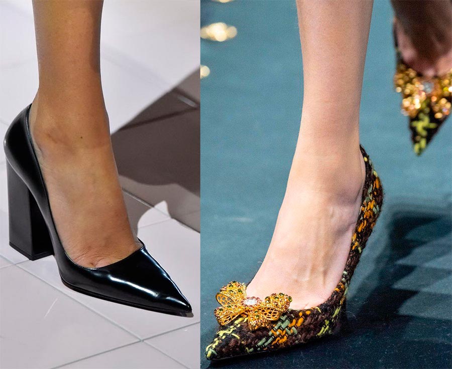 C'est pourquoi de nombreux créateurs proposent des bouts pointus : Jil Sander et Carolina Herrera ont des bottines à bout étroit et à talon aiguille fin, Isabel Marant et Stella McCartney ont des bottines et des chaussures à talon bas épais, Louis Vuitton et Alietta ont chaussures classiques - escarpins à talons cloutés, et Agnona a des ballerines avec un nez pointu et étroit sans talon du tout, sur une course à plat.