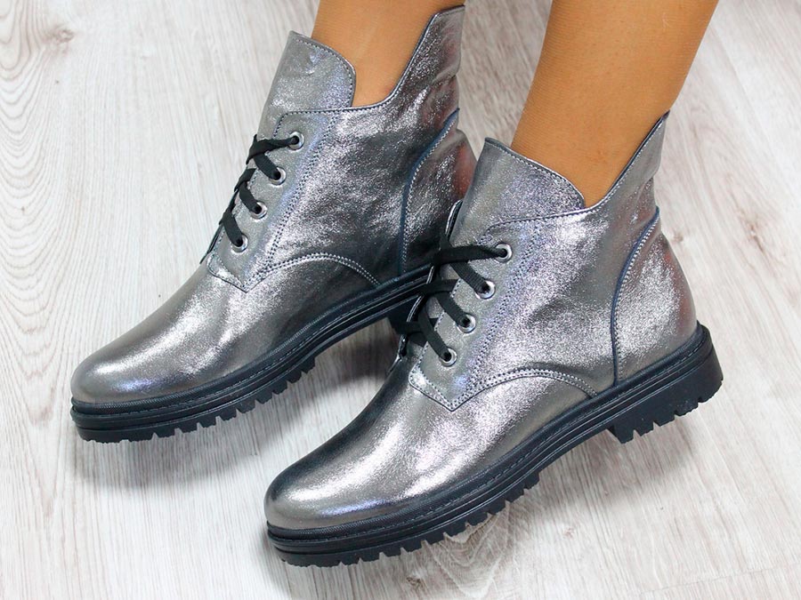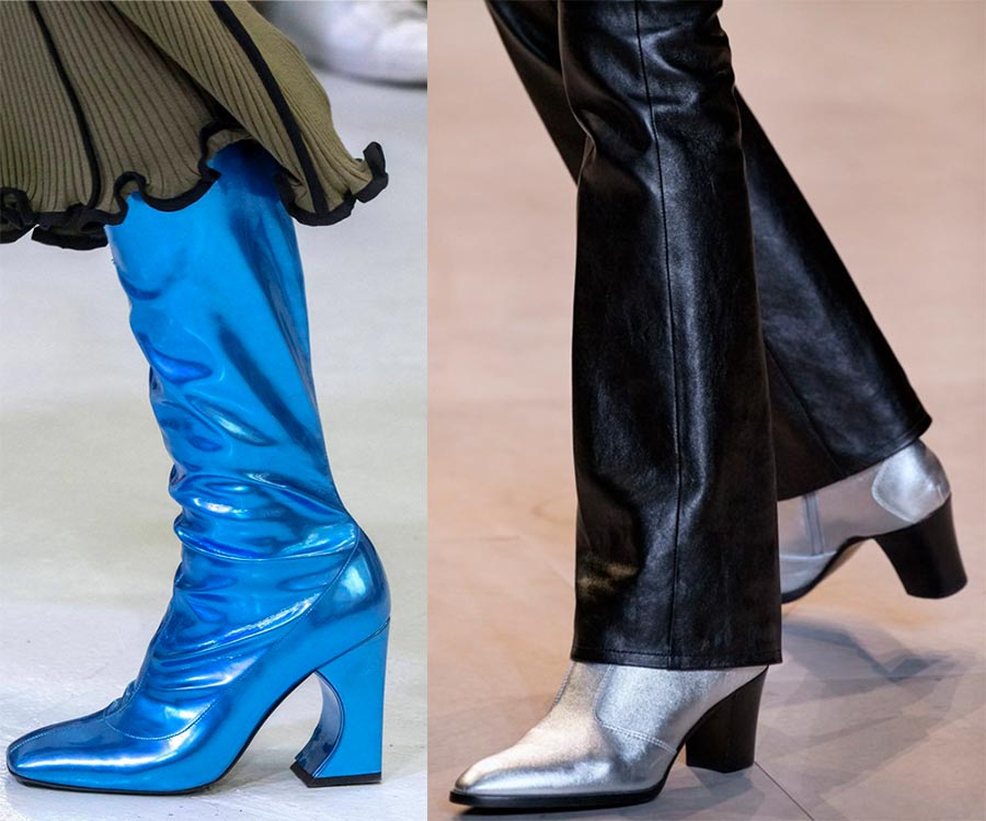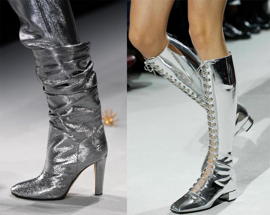 La texture du cuir métallisé convient parfaitement aux bottes hautes. Si vous choisissez des teintes plus sobres et sombres (noir métallique, graphite, bleu foncé, vert foncé ou violet), comme chez les créateurs d'Alberta Ferretti, Tom Ford, Céline, alors de telles bottes seront beaucoup plus appropriées dans un look professionnel que, par exemple, la laque. Pour les bottines, chaussures, slip-ons, mocassins, vous pouvez également opter pour des couleurs métalliques vives, comme en témoigne le podium de la marque Rick Owens.