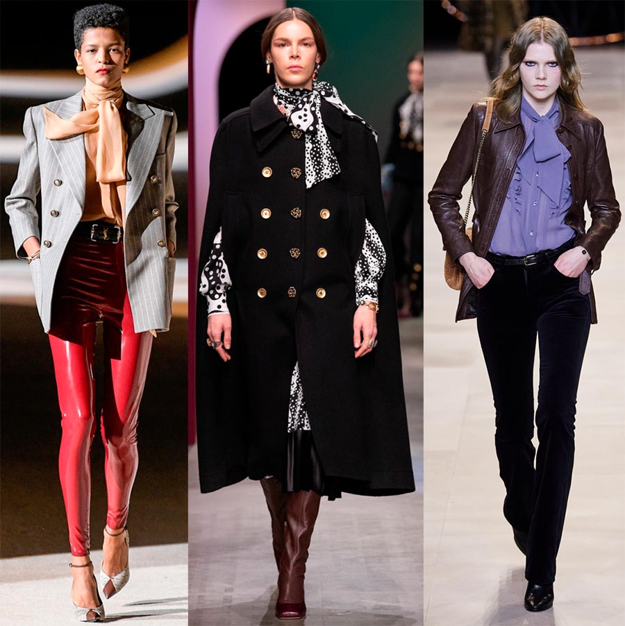 Alberta Ferretti, Ports 1961, Saint LaurentIl existe de nombreuses options pour les arcs. Le plus souvent, il y a des cols à nœud sur les chemisiers et les robes, des nœuds volumineux théâtraux ou des rubans noirs noués sous le col.