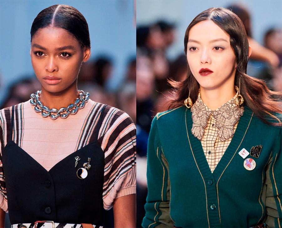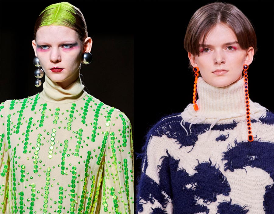 Les chaînes sont pertinentes, à la fois en métal et en plastique. Off-White présente de grandes chaînes de collier noires lors des salons, et les boucles d'oreilles à chaînes multicolores de la marque peuvent être incluses dans les tendances.