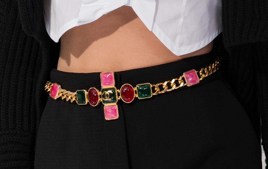 Une boucle brillante sur une chaîne à porter à la ceinture, bien sûr, doit être attribuée aux bijoux fantaisie. Le style bohème du défilé Céline est sans égal.