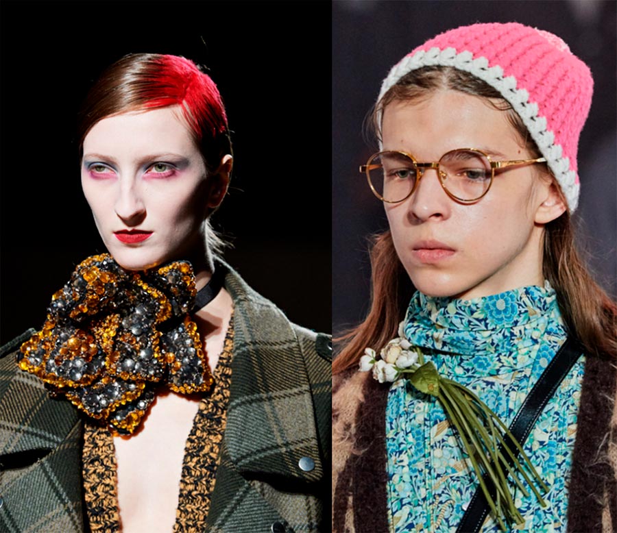 S'il vous semble que les bijoux en tissu ne sont pas à la mode, alors Dries Van Noten et Gucci ne seront pas d'accord avec vous. Leurs fleurs servent d'accents dans les images. Je vous conseille de vous en souvenir en cas de stylisme d'une séance photo.