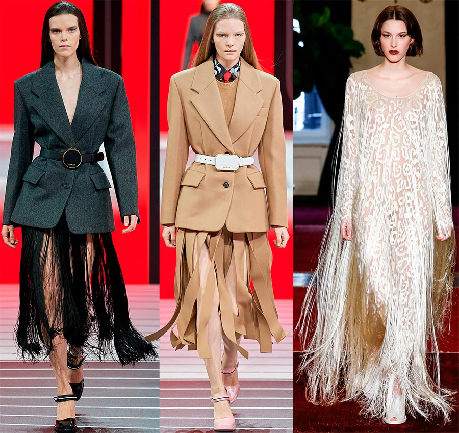 Il n'est pas nécessaire d'énumérer les saisons passées au cours desquelles la frange a connu un succès inégalé, il y en a pas mal. Dans la prochaine saison automne-hiver, la frange est incluse dans la tendance de la mode. Mais comment est-elle ? Côté longueur, la plupart des créateurs ont préféré une frange longue et un volume important. Parfois, il atteint une taille, une forme incroyable et même un volume excessif. Vous pouvez la rencontrer sur n'importe quel vêtement et accessoire.