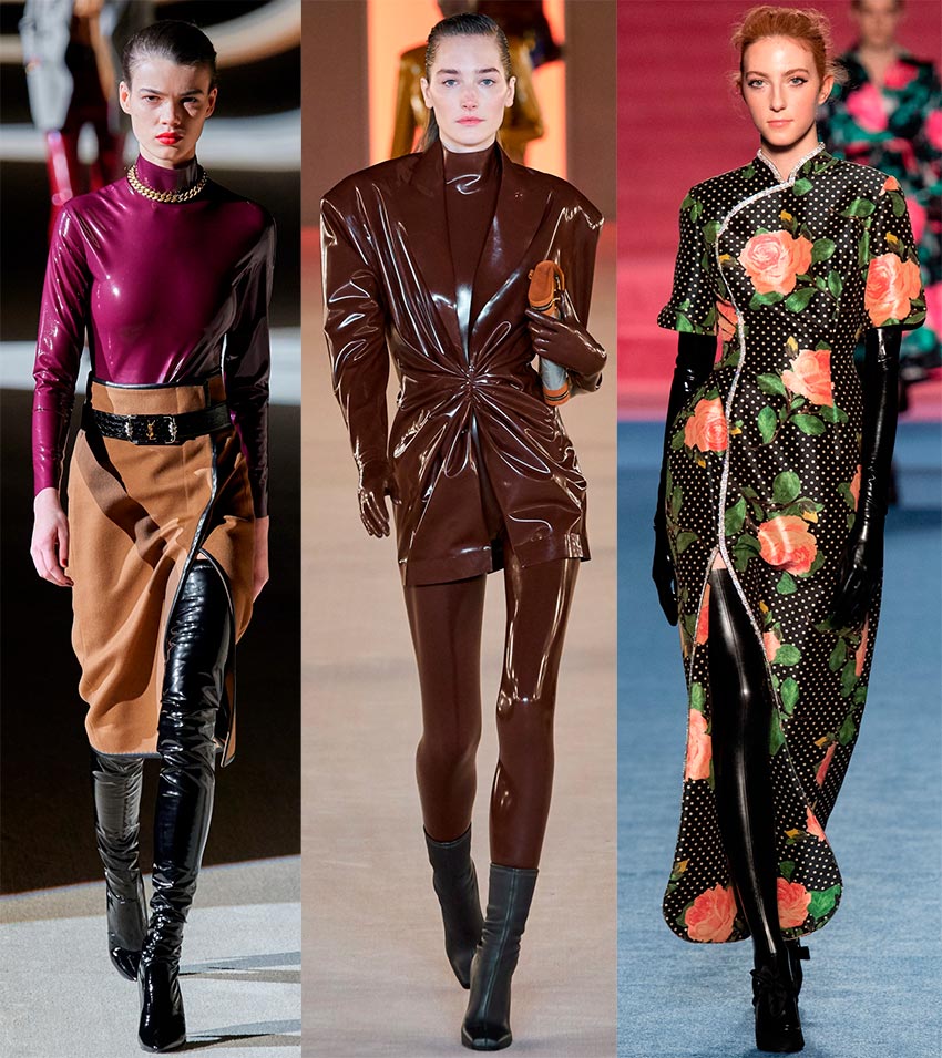 Dans la collection Saint Laurent, le latex est devenu un motif phare. Les filles minces peuvent expérimenter avec des vêtements fabriqués à partir de ce matériau audacieux. Une chose est sûre, le matériau n'est pas pour l'hiver, ni pour l'été - il y fait à la fois froid et chaud.