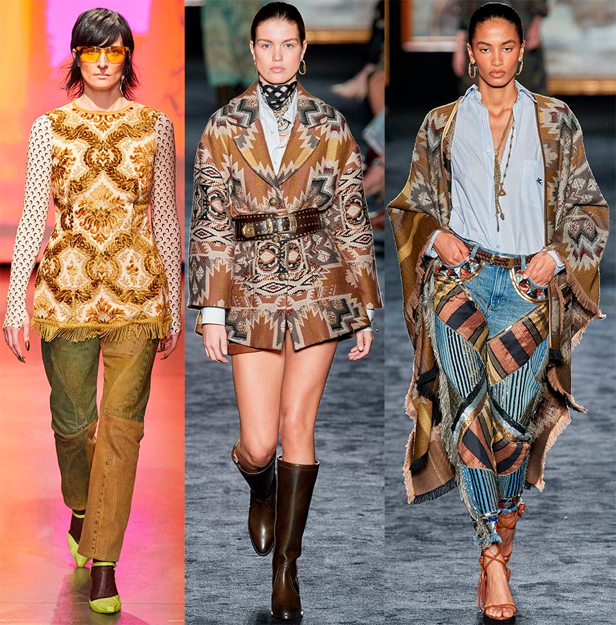 Tapisseries ou impression de tapisserie. Bien que les deux puissent être en même temps, par exemple, comme Marine Serre ou Etro.